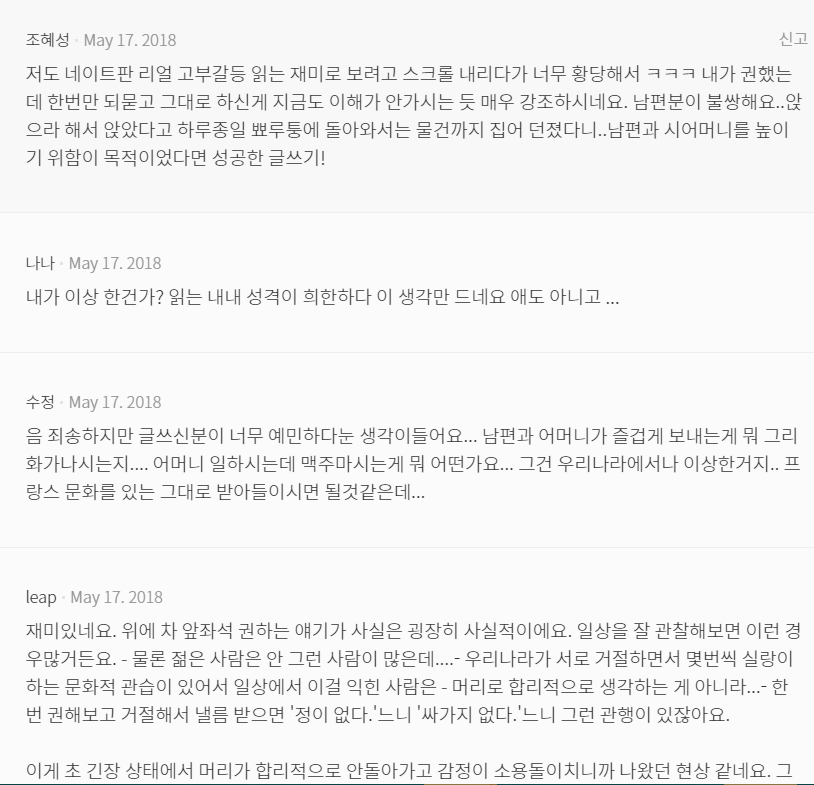 2 글쓰기 모임에서는 프랑스 남자와 사는 이야기를 썼습니다. 사적인 이야기라 많이 망설였는데, 글쓰기 모임에서 꾹 참고 써 내려가니, 연재 제의도 받게 되었습니다. 시어머니를 무서워(싫어)했던 경험도 진짜 솔직하게 썼는데...악플을 비롯한 비난을 엄청 받았으나, 글쓰기 모임 멤버들이 웃어주고 격려해 준 힘으로 강인해질 수 있었습니다. "비판글 달리면? 그 주제를 더 더 열심히 쓸 거야! 그 주제가 바로 중요한 이슈다!"