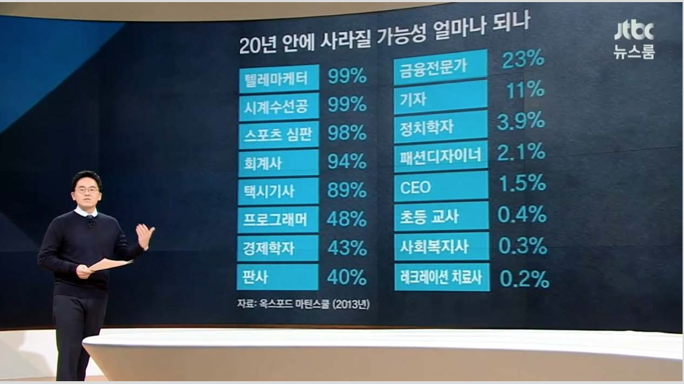 (윤지) "네, 그래서 그런지 한 뉴스 채널 팩트체크에서 20년 안에 사라질 일자리에 대한 내용을 다룬 적이 있어요. 저 내용을 보면 텔레마케터부터 판사까지 많은 직종이 사라질 것이라고 이야기를 했어요."