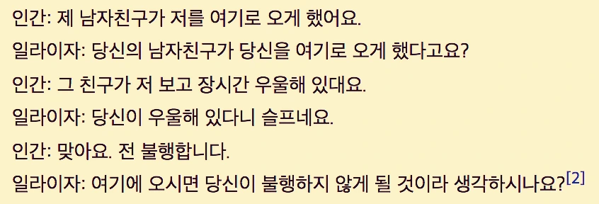 이렇게 대화를 이어나갔고, 그 과정에서 환자들은 실제로 의사와 대화를 나누고 있다고 착각했다고 한다. 더해서 환자들은 일라이자와의 상담이 실질적인 도움을 줄 수 있다는 생각까지 했다고 한다.