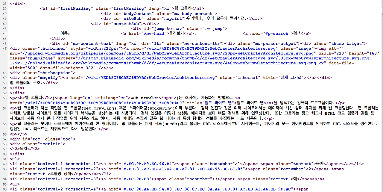 이렇게 정형화된 규칙을 토대로 만들어진 웹 페이지는, 하나의 페이지에서 다른 페이지로 넘어가기 위해서 URL 주소를 이용한다. 이것은 개별 화면의 소스코드 상으로 확인할 수 있으며, 웹 크롤링의 경우 이러한 규칙들을 따라가면서 링크된 페이지를 열어보고 필요한 정보를 수집하는 과정을 거친다.