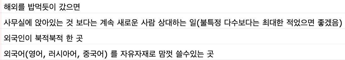 대학생, 취준생일 때는 일에 있어서 내가 무엇을 잘하고 무엇을 원하는지 전혀 몰랐다. 대학 다니면서는 외국어 공부만 열심히 하였고, 호기심이 많아서 많은 곳을 여행해보고 교환학생을 4번이나 갔다 오면서 이곳저곳에서 살아보느라 바빴기 때문이다. 나는 대학생으로서 즐길 수 있는 모든 것들을 즐기기 위해 모든 에너지를 썼다. 물론 이 과정에서 내가 앞으로 무슨 일을 하며 먹고살지 진지하게 고민해본 적이 있긴 하지만 아무리 책상에 앉아서 고민을 해봐도 답이 나오질 않았다. 공무원, 자격증 등을 철저하게 계획을 세우면서 준비하는 친구들을 보며 나는 왜 저런 진지한 열정이 없는가 스스로를 자책해보기도 하였다. 물론 덩달아 나도 얼른 저런 걸 시작해야 하나 조바심이 들기도 하였지만 왠지 모르게 청춘 낭비라는 생각이 들어서 하나도 시작을 못.. 아니 안 했었다. 지금 돌이켜보면 내가 무슨 일을 좋아하는지 모르는 것은 한 번도 일을 제대로 해보지 않았기 때문이고, 모르는 것은 너무나도 당연한 것이고, 그 당시 무언가를 열심히 준비했던 친구들 또한 정답을 알고서 준비한다기보다는 무엇을 해야 할지 몰라 당장 우선 할 수 있는 거라도 시작했던 것일 수도 있겠다는 생각이 든다. 많은 음식을 먹어보고 나서야 내가 좋아하는 음식이 무엇인지 자신 있게 알 수 있게 되는 것처럼, 많은 일을 경험해봐야지만 내가 무슨 일을 좋아하는지 깨달을 수 있다. 같은 이치로 그 당시 우리가 무슨 일을 좋아할지 모르는 것은 너무나도 당연하지 않은가. 아무튼 졸업할 때쯤 이제는 취업을 해야 한다 길래 부랴부랴 이곳저곳 지원하기 시작했고, 100군데 이상 무작정 지원을 했지만 당연히 광탈하였다. 실패 후, 무작정 지원하지 않고 내가 어떤 회사를 다니기를 원하는지 다시 한번 최대한 구체적으로 생각해보려고 노력했고 아래는 당시에 내가 적었던 노트이다.