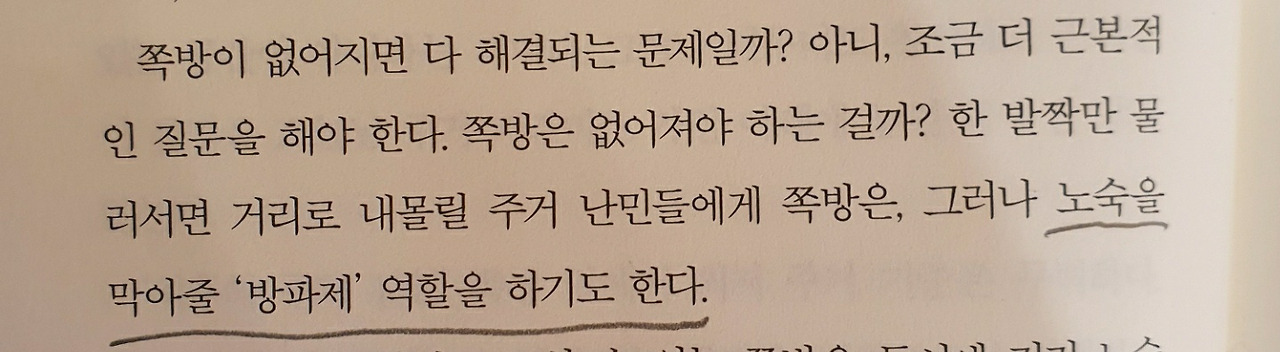 이와 같은 쪽방을 부조리하다고 생각할 수 있으며, 이는 과연 맞는 생각이다. 자연스레 쪽방을 없애면 주거빈곤 문제를 해결할 수 있다는 명쾌한 결론이 나올 수도 있다. 허나, 쪽방이 없어진다고 주거빈곤 문제가 해결되는 것은 아니다. 오히려 쪽방은 주거 난민을 노숙으로부터 막아주는 '방파제' 역할을 한다. 쪽방을 비롯한 취약주거공간에 거주하는 이들은 노숙을 피하기 위해 어쩔 수 없이 쪽방으로 밀려난 것이다. 즉, 쪽방이 사라진다면 거주민들은 길거리에 내몰리게 된다. 쪽방을 없애기 전에, 쪽방 거주민들이 노숙으로 밀려나지 않도록 대책을 세우는 것이 선행되어야한다. 이는 기사나 보도로 해결될 수 있는 단순한 문제가 아니다. 허나, 언론에서 쪽방과 같은 주거빈곤문제를 다루어 사회적 담론으로 이끌어낸다면 쪽방이 노숙으로부터의 방파제 역할을 도맡고 있는 고장난 현실을 고발하여, 이를 고치기 위한 진단이나마 가능할 것이다.