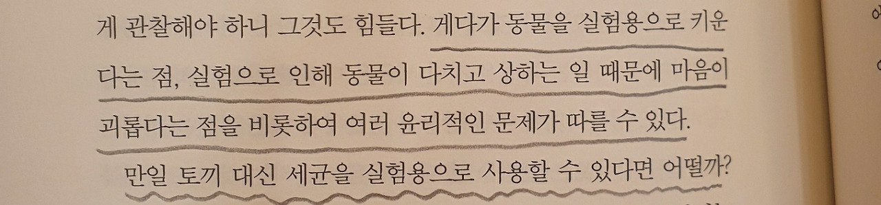 동물실험은 윤리적인 문제와 효율성 측면에서 모두 하자가 존재한다. 실험용 토끼를 온전하게 기르기 위해 투자되는 시간과 비용을 고려한다면 성장 속도가 빠르고, 비용도 크게 들지 않는 세균이 나을 수 있으며, 인간의 안위를 위해 동물을 실험용으로 가두어 키우는 비윤리적 행위 역시 감수하지 않을 수 있다는 저자의 조심스러운 주장은 불필요한 희생을 막을 수 있는 지름길이 될 수 있다.