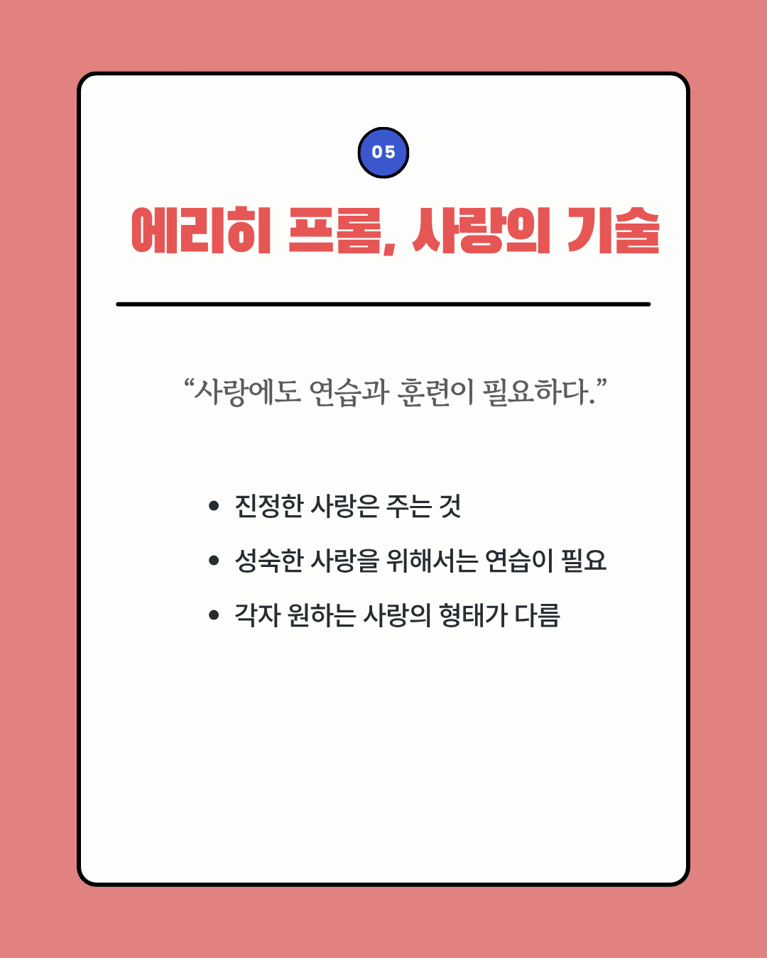 '사랑'을 주제로 질문을 던지고 답하는 고전 중 하나. 문체가 어렵긴 하지만, 우리가 진정한 사랑을 위해서 무엇을 해야 하는지 되짚어주고 있다.