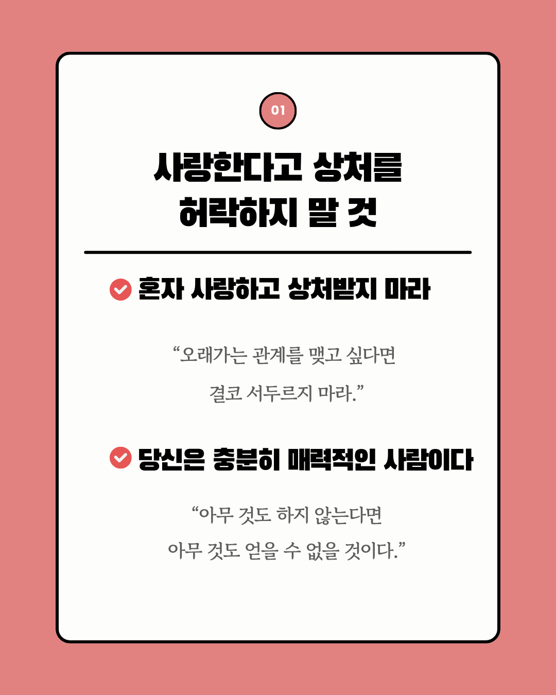 제목처럼 성숙한 사랑이나 건강한 연애를 하려면 어떻게 해야 하는지 저자의 경험을 바탕으로 잘 풀어내고 있다.