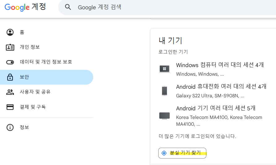 프로필 클릭> 구글 계정 관리> 보안> 분실 기기