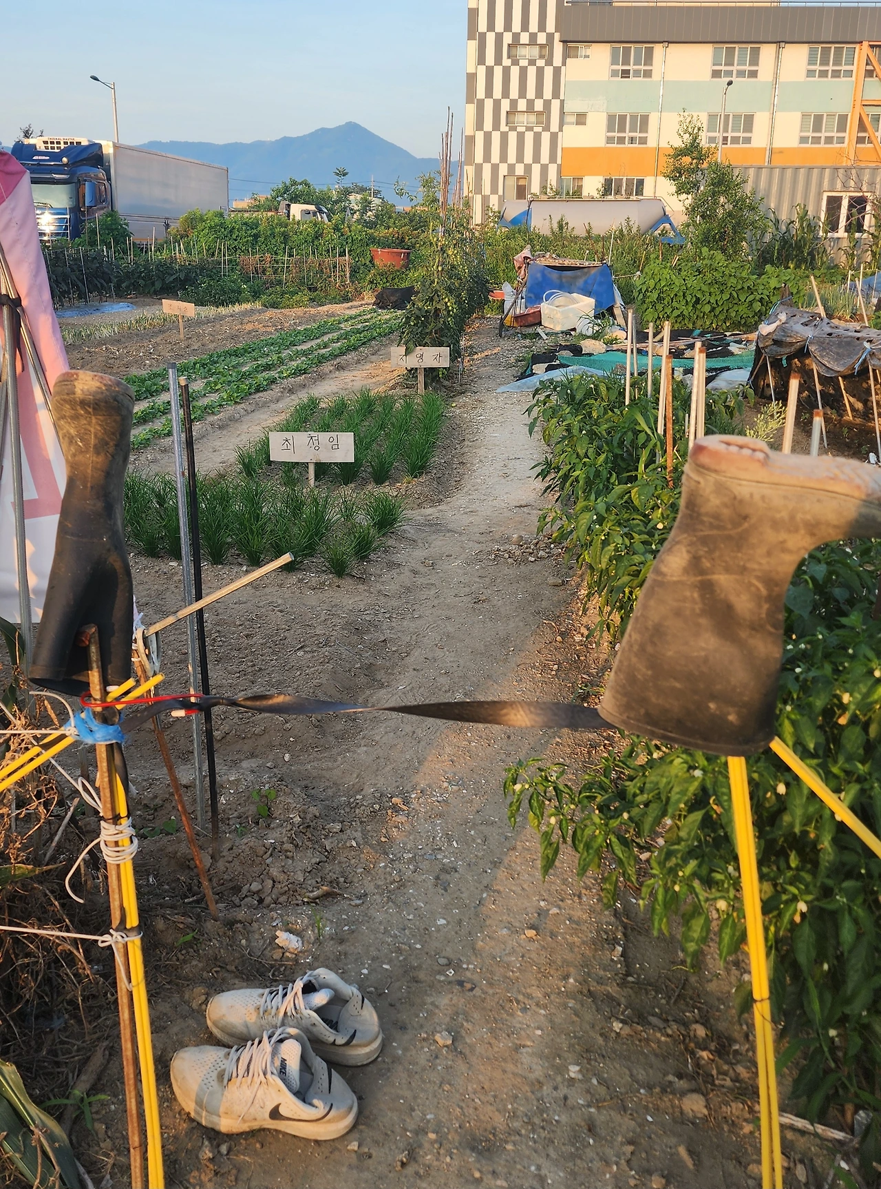 논밭이 즐비한 우리 동네엔 아침 일찍 밭일하는 분들이 더러 보인다. 주말 농장인지 텃밭에 이름이 적힌 팻말이 보인다. 구겨진 운동화와 거꾸로 뒤집어놓은 장화, 그리고 농기구. 어릴 적 외가가 생각난다.