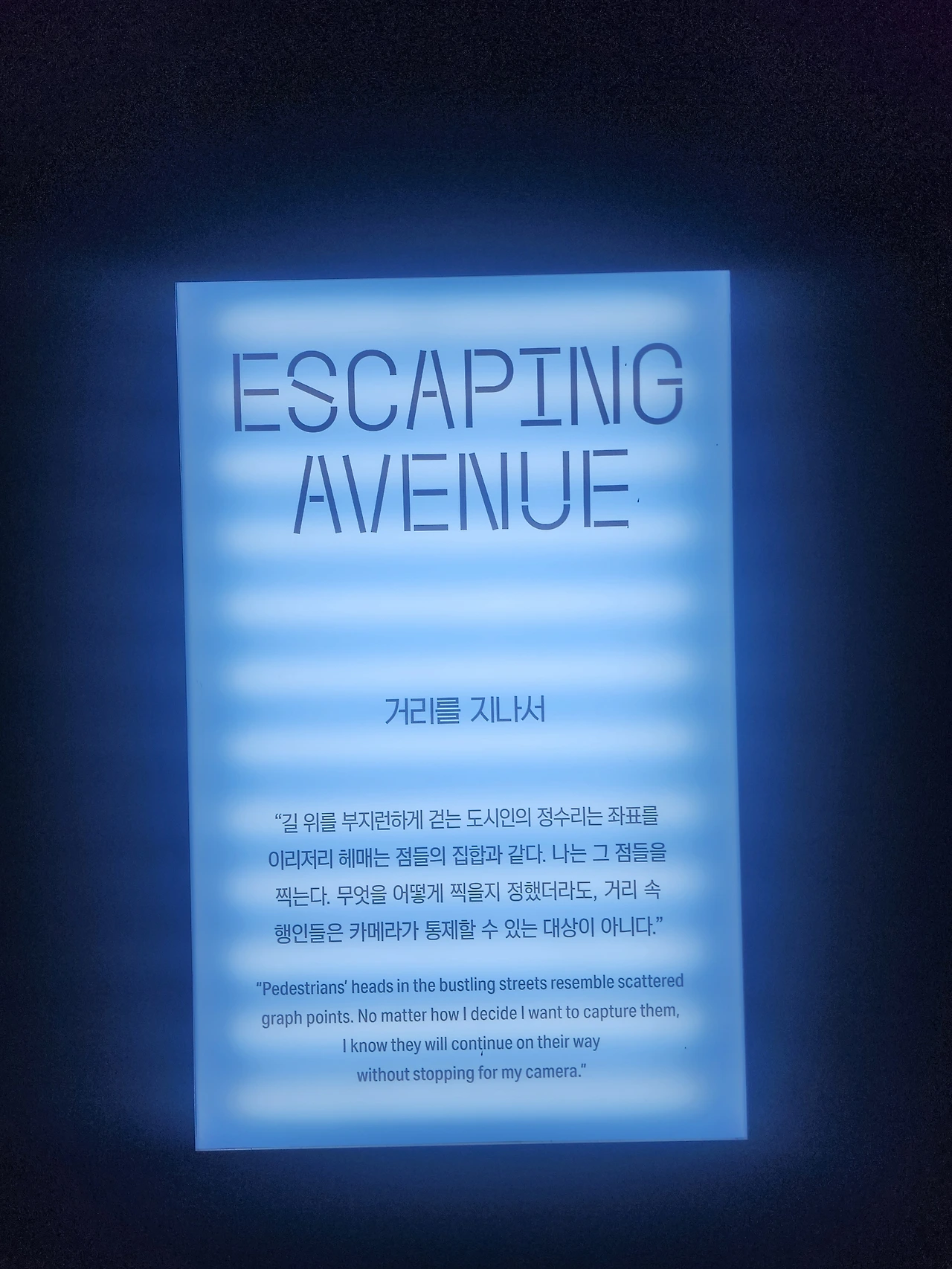 어둠을 밝히는 도시의 수많은 조명처럼 각 개인의 치열한 일상이 모여 하나의 피사체를 이루고, 도시를 떠도는 방랑자들이 옥상 위 테라스나 공원에서 잠시 쉴 수 있다. 사진이라는 매개체를 통해 일상을 낯설게 바라보고, 익숙함을 벗어던지고 싶은 분들한테 추천하고 싶다.