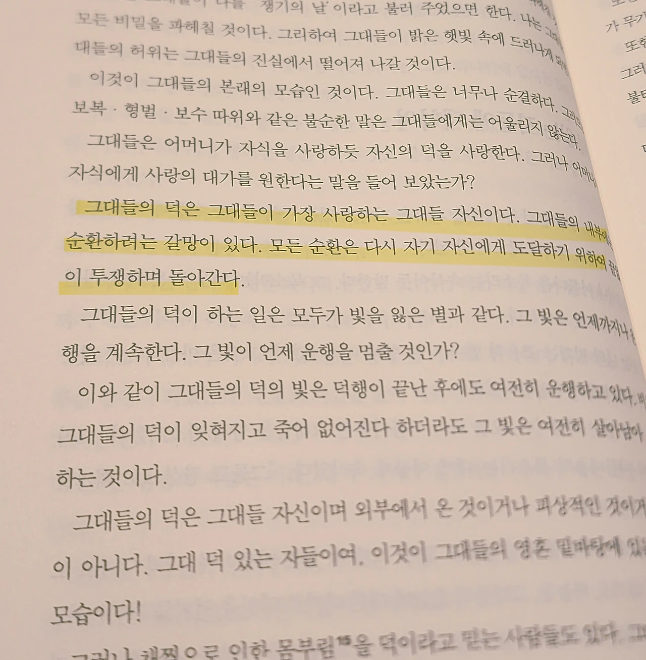 총 4부로 구성된 이 책은 키워드 중심으로 짜라투스트라가 한 얘기를 자유롭게 풀어내고 있다. 읽다 보면 고개가 저절로 끄덕여지거나 재고하게 만드는 구절들이 제법 많다.