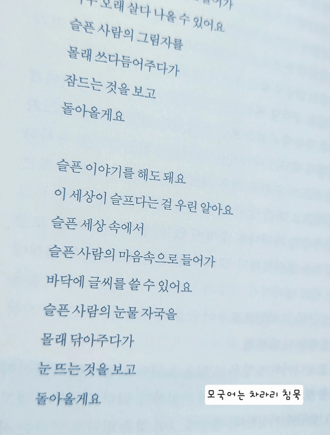 저자의 말처럼, 슬픈 사람의 마음속으로 들어가 눈물을 몰래 닦아주고 나 또한 위로를 받을 수 있기를 기도해 본다.