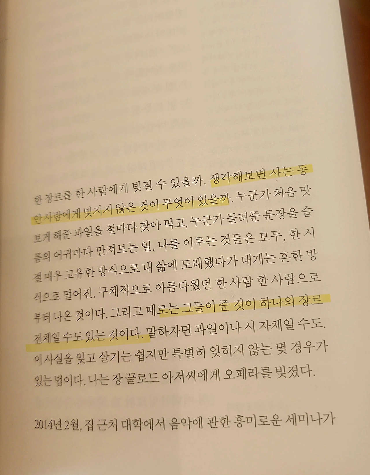 생각해 보면 사는 동안 사람에게 빚지지 않은 것이 무엇이 있을까. 나를 이루는 것들은 모두, 한 시절 매우 고유한 방식으로 내 삶에 도래했다가 대개는 흔한 방식으로 멀어진, 구체적으로 아름다웠던 한 사람 한 사람으로부터 나온 것이다. 그리고 때로는 그들이 준 것이 하나의 장르 전체일 수도 있는 것이다.