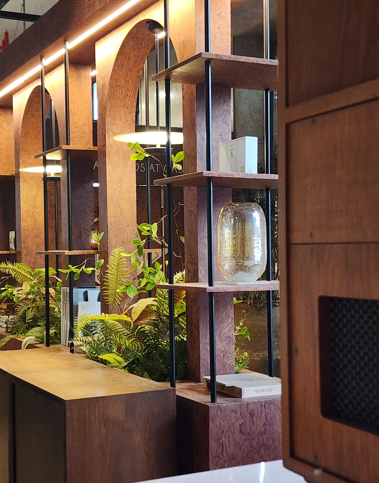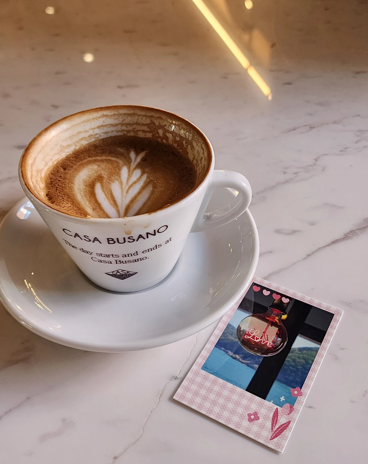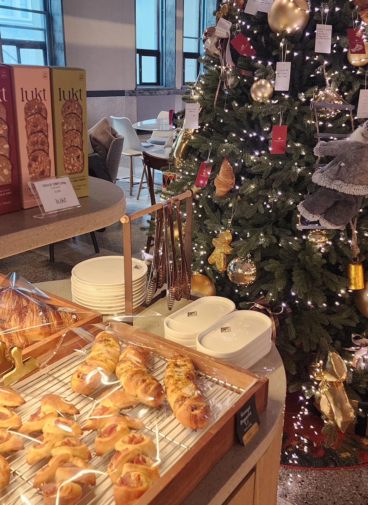 건물 앞쪽으로 들어가니 카페 간판이 보였고, 개방감 있는 인테리어가 펼쳐졌다. 바에 자리를 잡은 뒤 디저트 코너를 먼저 둘러보았다. 꾸덕한 느낌의 에그타르트를 접시에 담은 후 레스프레소 플랫화이트를 같이 주문했다.