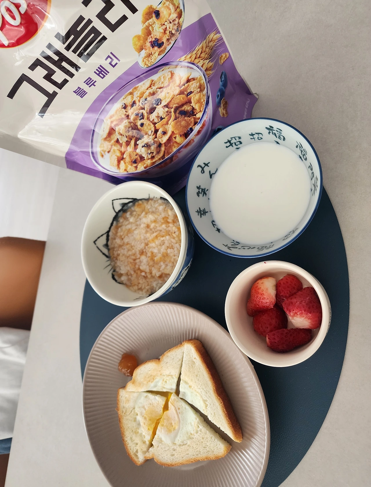 다음 날 아침, 식사 메뉴를 고르라고 하자 전부 다 먹겠단다. 하지만 토스트랑 누룽지를 맛있게 먹더니 수저를 놓았다.