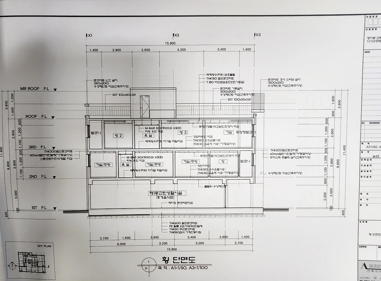 옥상까지 합쳐서 상가주택 층고는 9미터 남짓. 층마다 3미터씩 잡아도 단열재, 전선 등을 넣으면 실제 층고는 훨씬 낮아진다. 문제는 이번에 짓고 있는 건물의 1층 높이가 2400mm. 다른 건물에 비해 많이 낮은 편이다. 주거지인 2층과 3층의 층고 때문에 조금 낮을 거라 예상은 했지만, 요즘엔 층고를 높이는 추세인 데다 상가라는 특성 때문에 높을수록 개방감이 있어서 선호된다.
