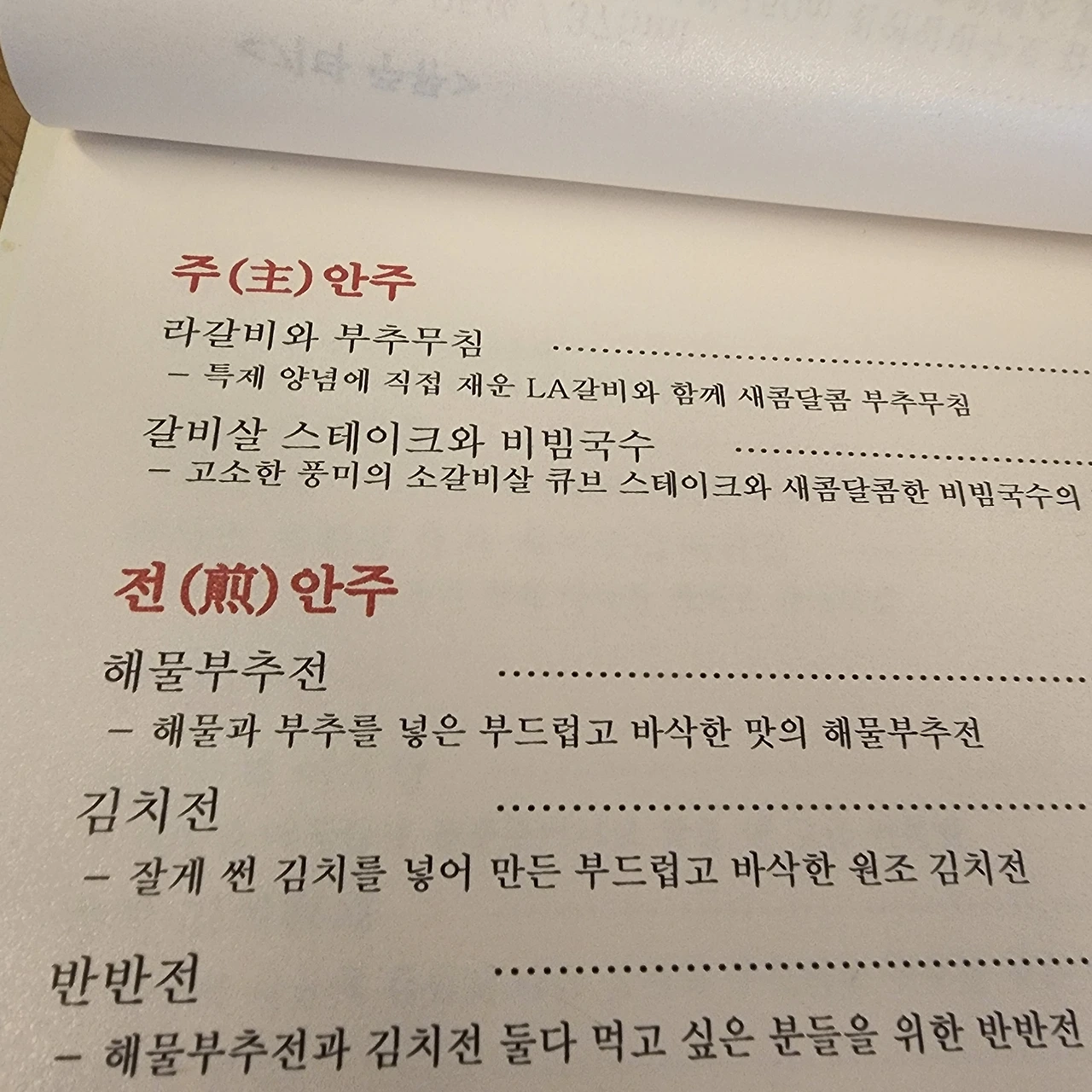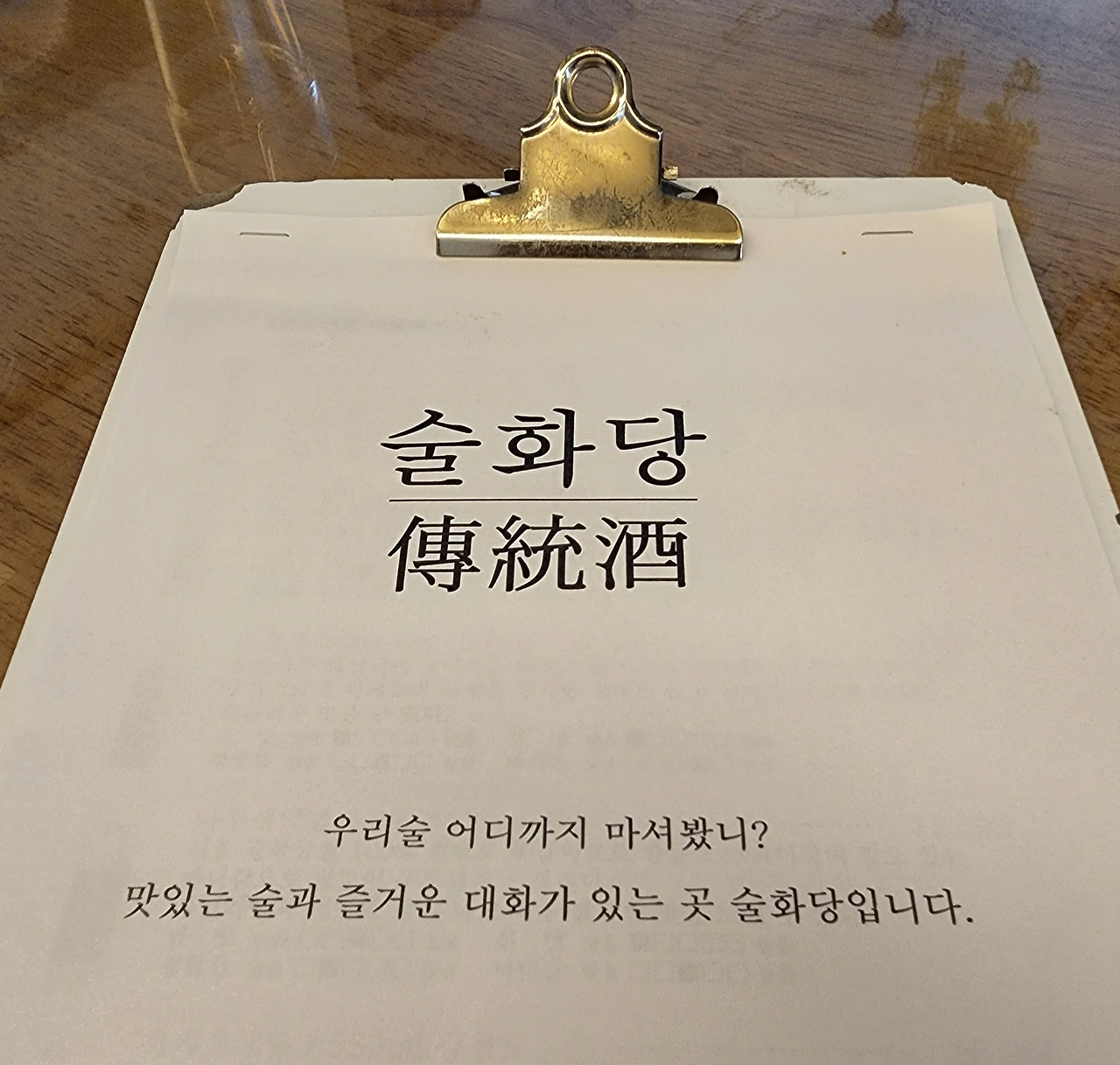 문을 열고 들어서자 직원이 자리를 안내해준 뒤 메뉴를 갖다 주었다. 한 장씩 넘겨보는데 생각보다 막걸리랑 안주 종류가 많아서 살짝 놀랐다.