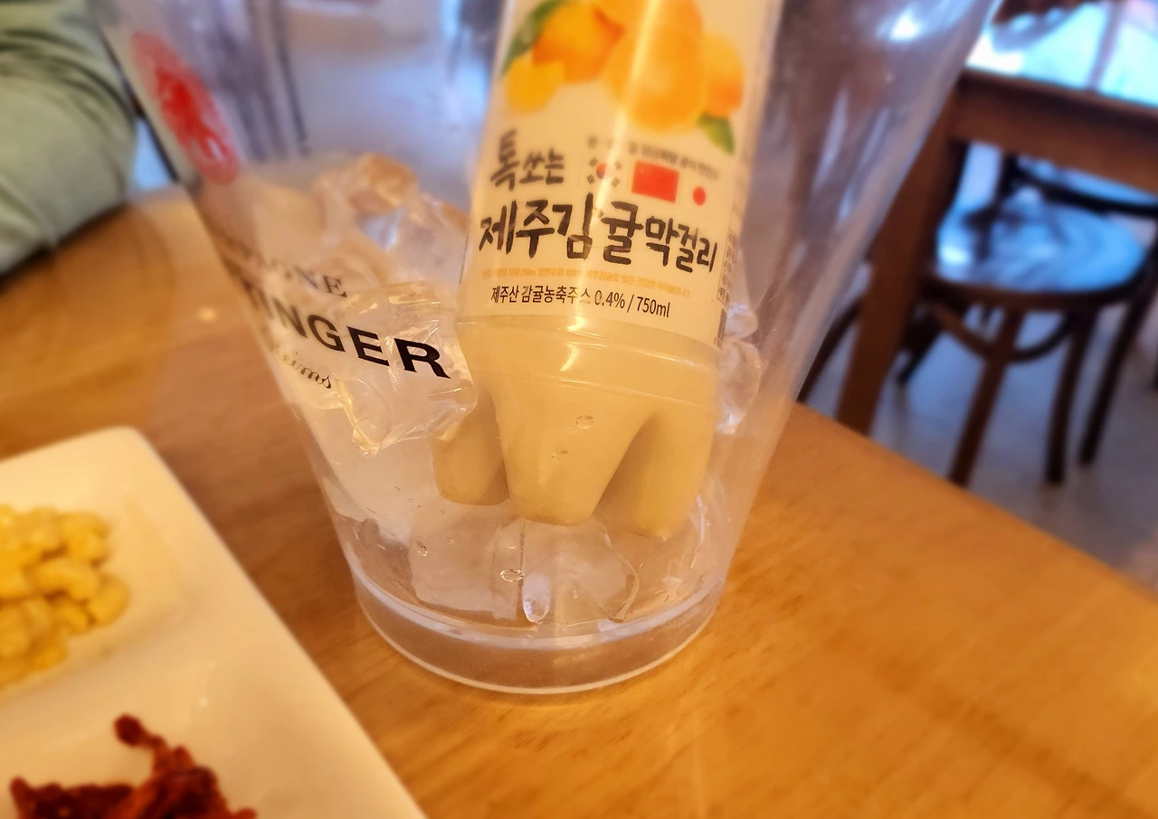 "그러게요. 막걸리는 청량감이 있는 게 마시기 좋을 텐데... 감귤 막걸리 어때요?"
