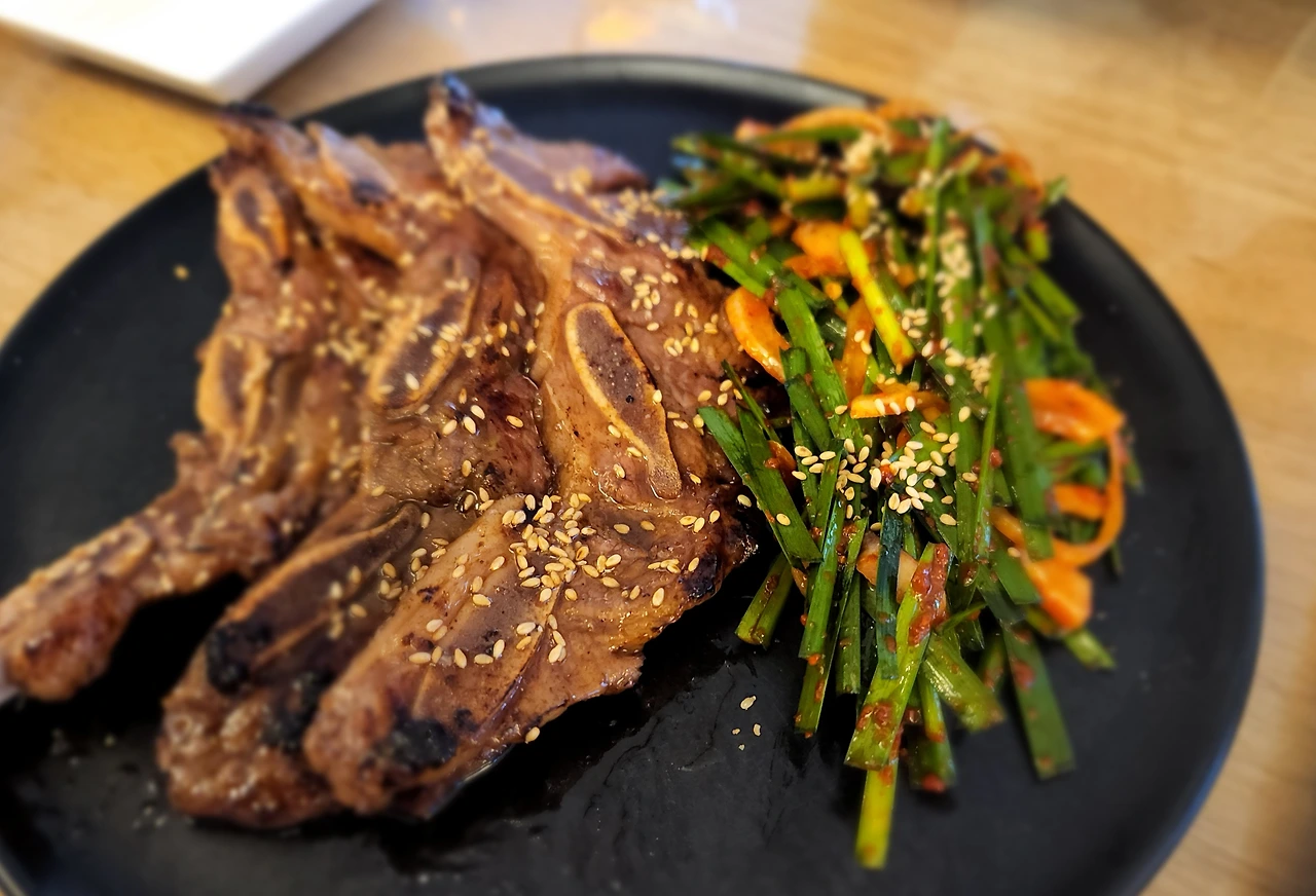 "그럼 안주는... 다른 데서 먹기 힘든... 라갈비와 부추무침 어때요?"
