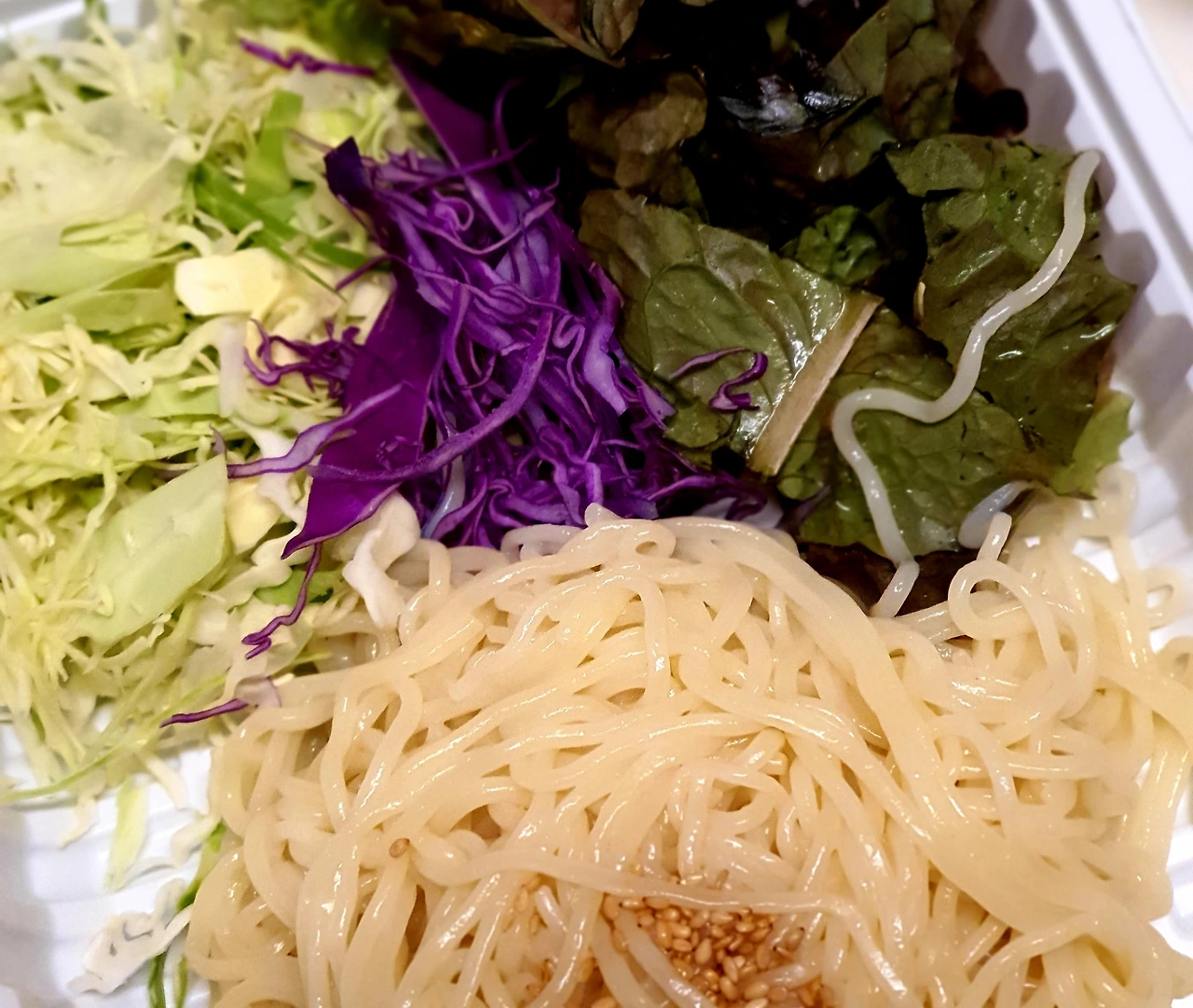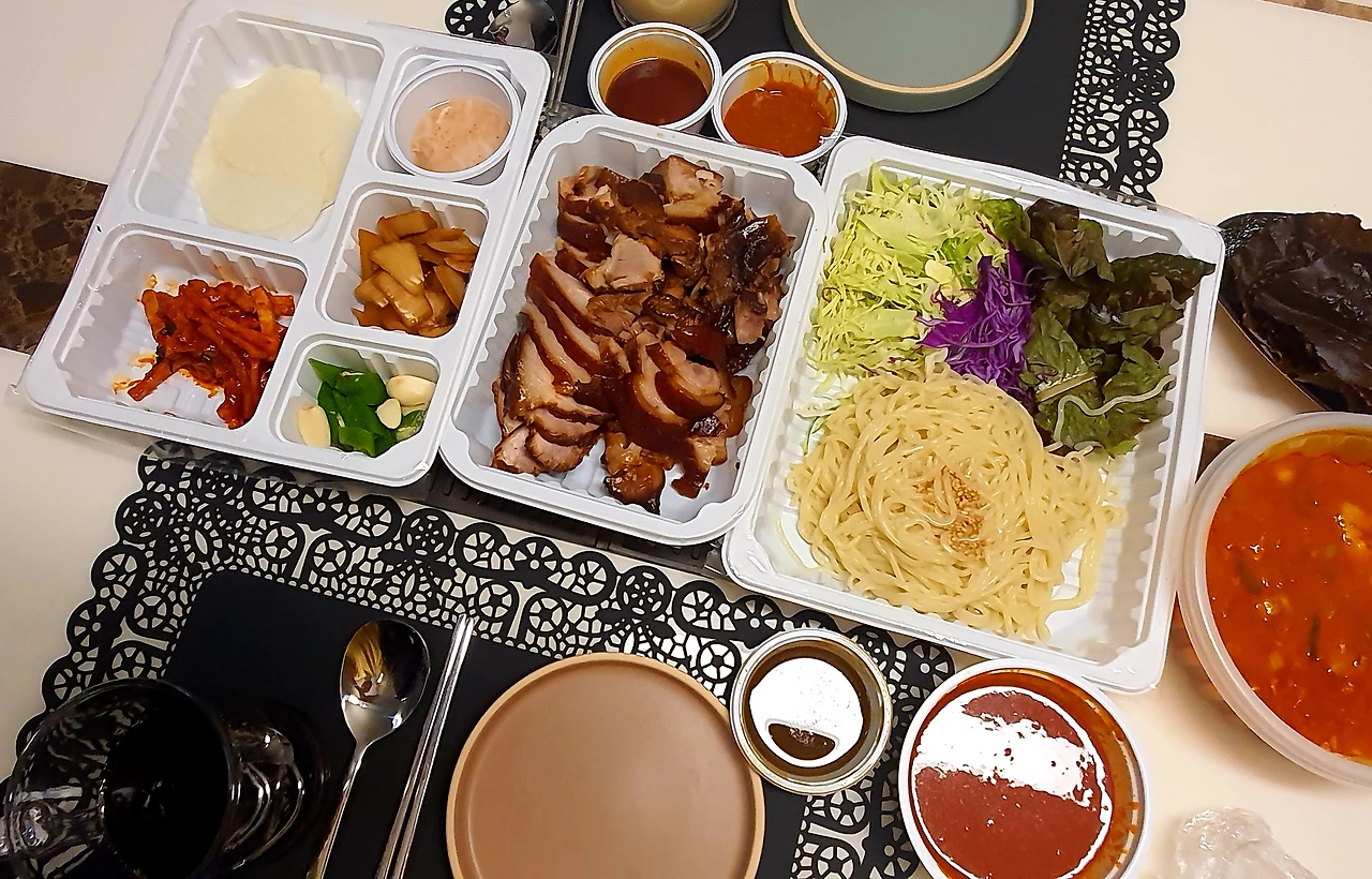 "고기가 생각보다 부드럽네. 쫄면도 적당히 매워서 맛있고, 소스도 다양해서 맘에 들어. 근데 쌈무는 조금 아쉽네."