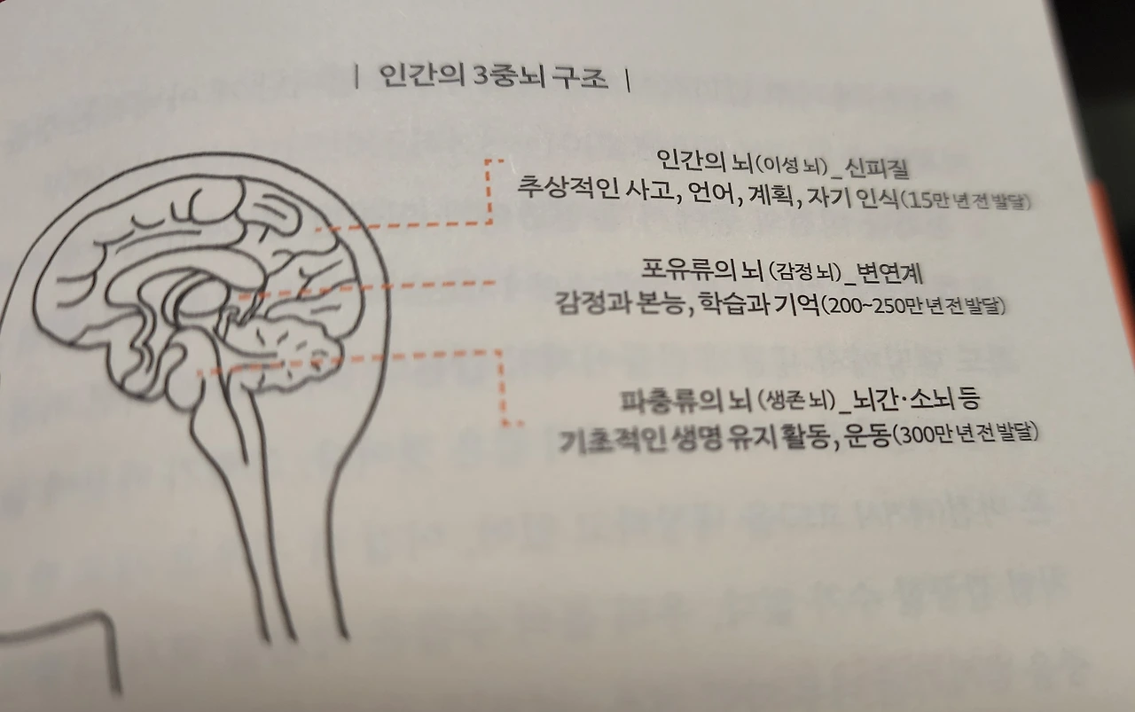 비교적 최근에 만들어진 뇌가 바로 인간의 뇌이다. 그러나 안쪽의 뇌들에 비하면 다소 반응이 늦고, 주의를 집중해야 잘 작동한다. (126쪽)