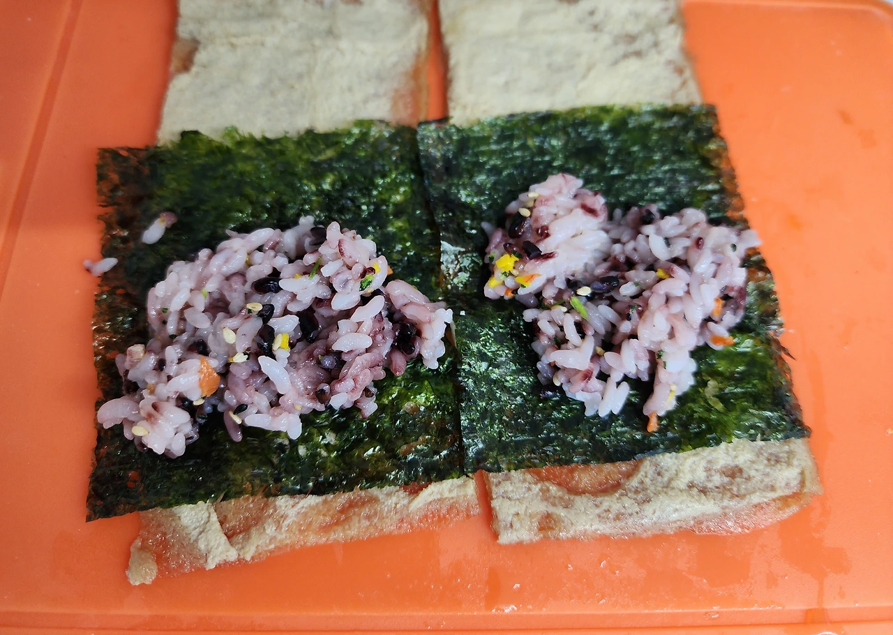 유부 위에 김을 깔고 미리 준비해 둔 밥을 올린다. 김밥처럼 돌돌 말면 완성:)