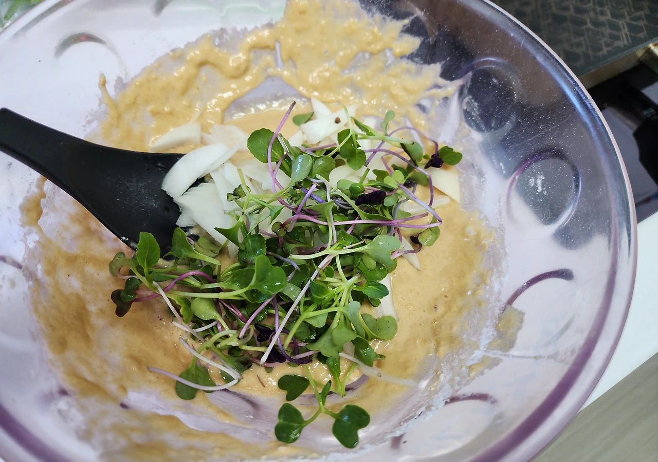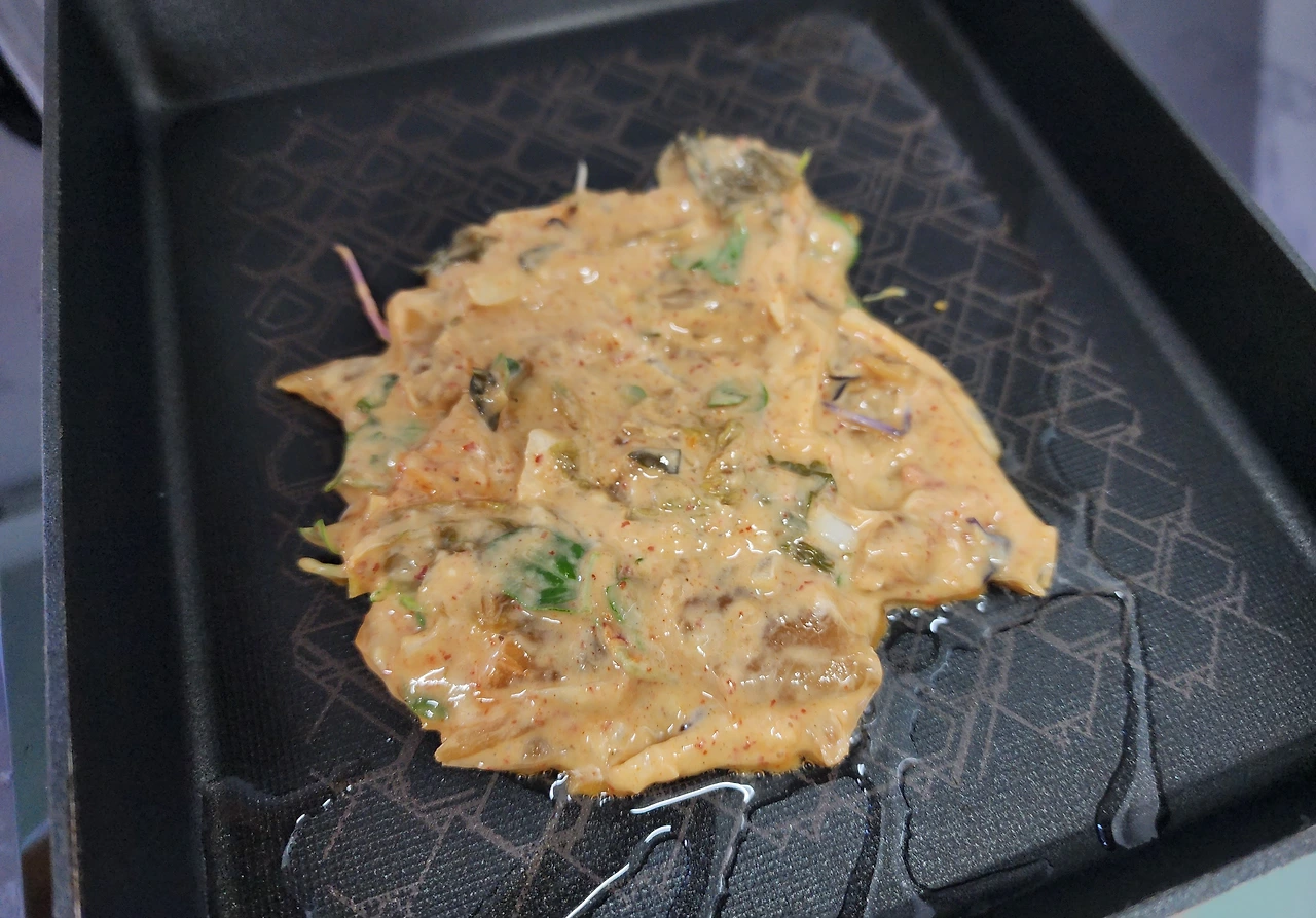 반죽과 굽기가 다한 김치전. 반죽은 팬케이크보다 살짝 되게 하면 적당하다. 고추 대신 어린잎을 곁들이고 작게 구워서 먹기 좋게 자른다.