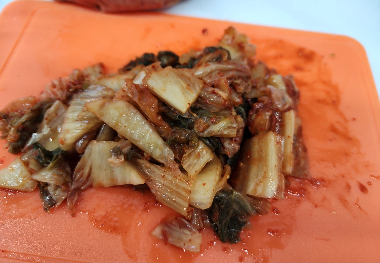 먹다 남은 된장찌개, 햇반, 유부롤, 그리고 김치.