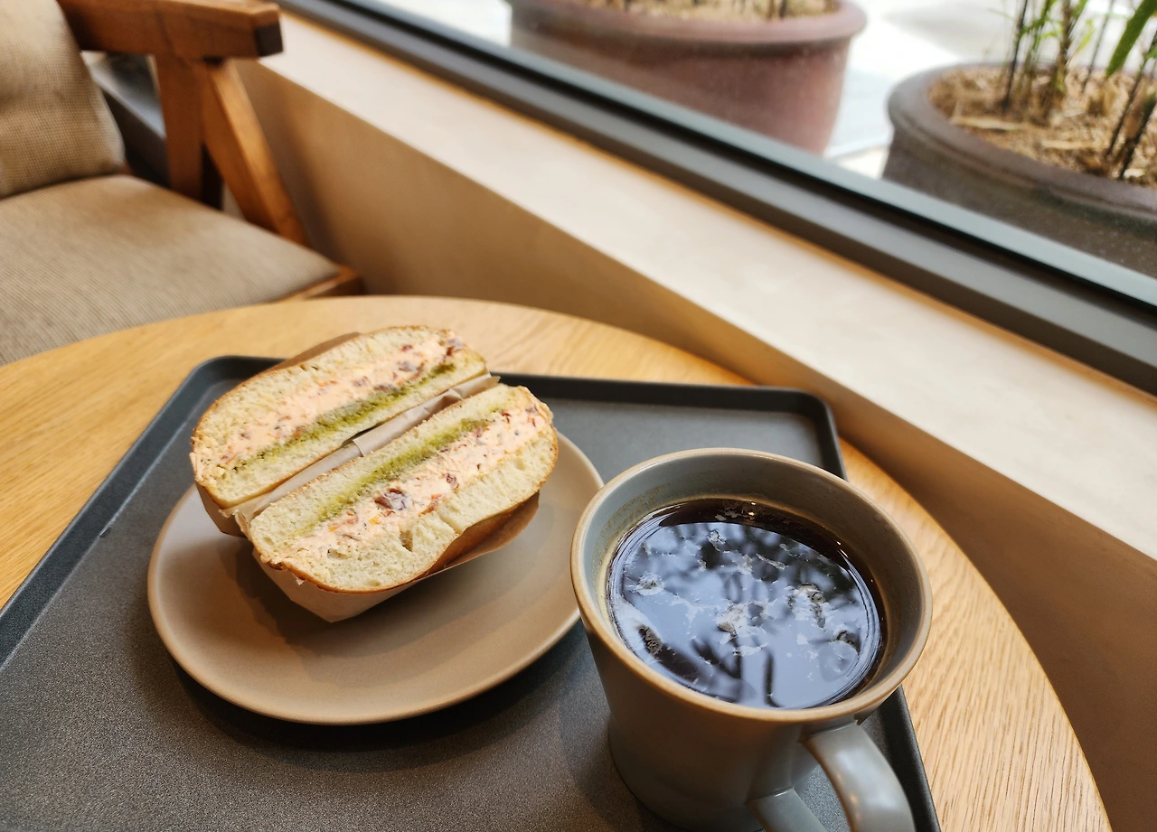 베이글 세트를 주문하니 바질토마토 크림치즈를 듬뿍 발라준다. 카페일 하면서 지겹도록 만들고 먹었는데도 좀처럼 질리지 않는다.