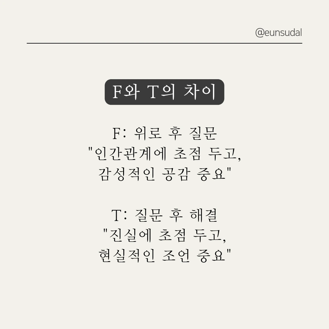 예를 들어, '나 아파서 조퇴했어.'라고 얘기할 경우 대부분 에프는 '얼마나 아픈데? 지금은 괜찮아?라고 물어보지만, 티는 '약은 먹었어? 병원은?'이라고 묻는 경우가 많다.