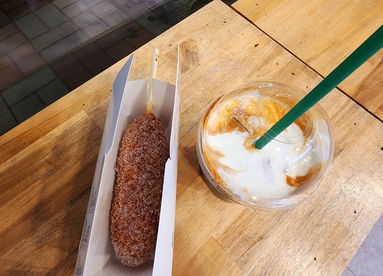 이상하게(?) 운동을 하고 나면 시원한 커피랑 칼로리 높은 음식이 당긴다. 운동하느라 땀 흘린데 대한 보상 심리 때문이리라. 핫도그를 주문하니 5분 정도 걸린단다. 바로 옆이 카페라서 기다리는 동안 커피를 주문한다.