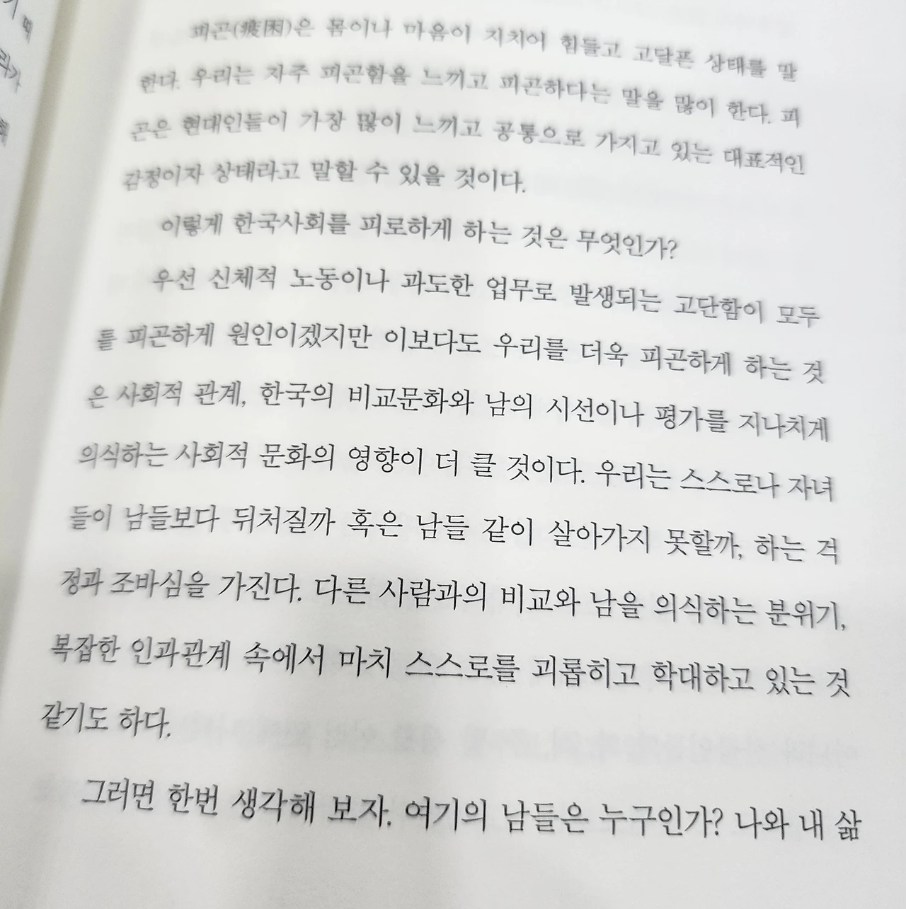 저자는 과도한 업무뿐만 아니라, 비교문화 역시 피로의 주요 원인으로 꼽는다. 동료뿐만 아니라 가족 구성원, 이웃, 친구들과 끊임없이 비교당하는 사회가 가져다주는 정신적 피로감은 생각보다 크다.