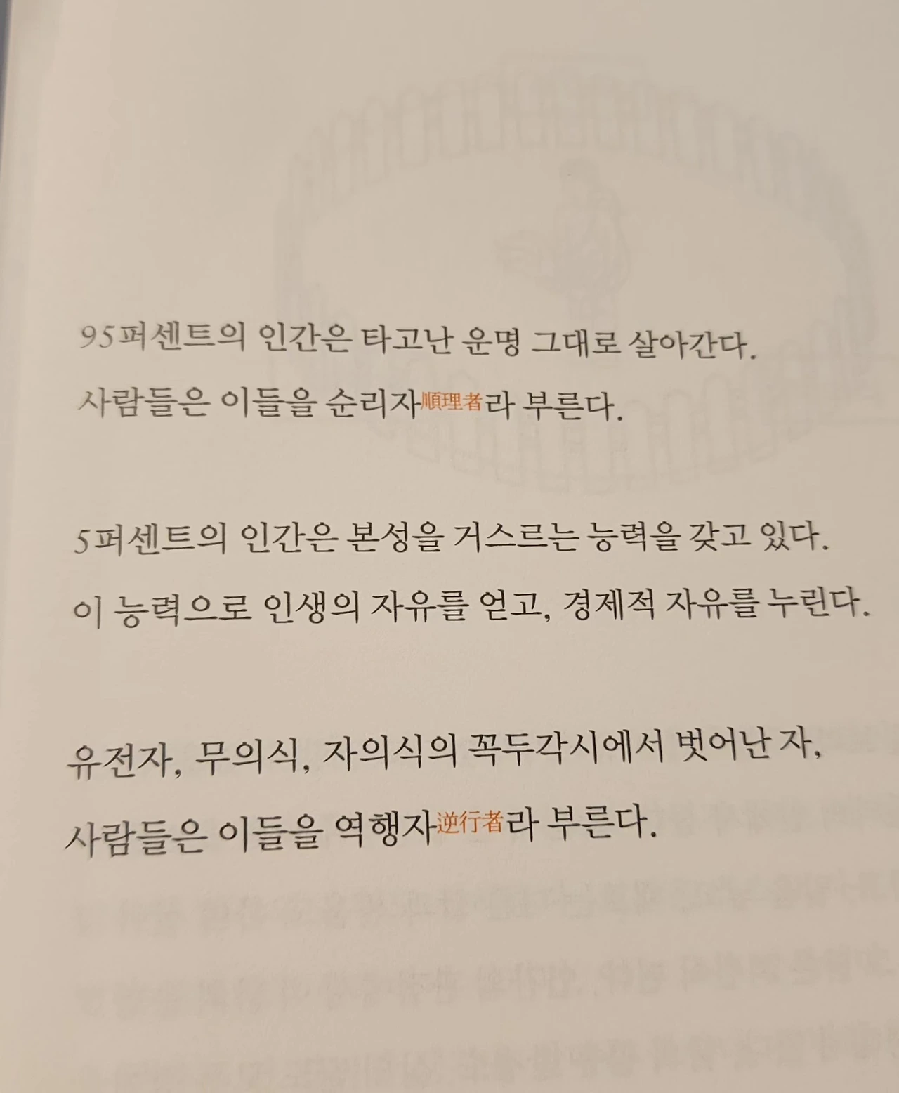 자청의 <역행자>라는 책에서도 타고난 본성을 거스르는 자만이 인생의 자유를 얻고, 경제적 자유를 누릴 수 있다고 강조한다.