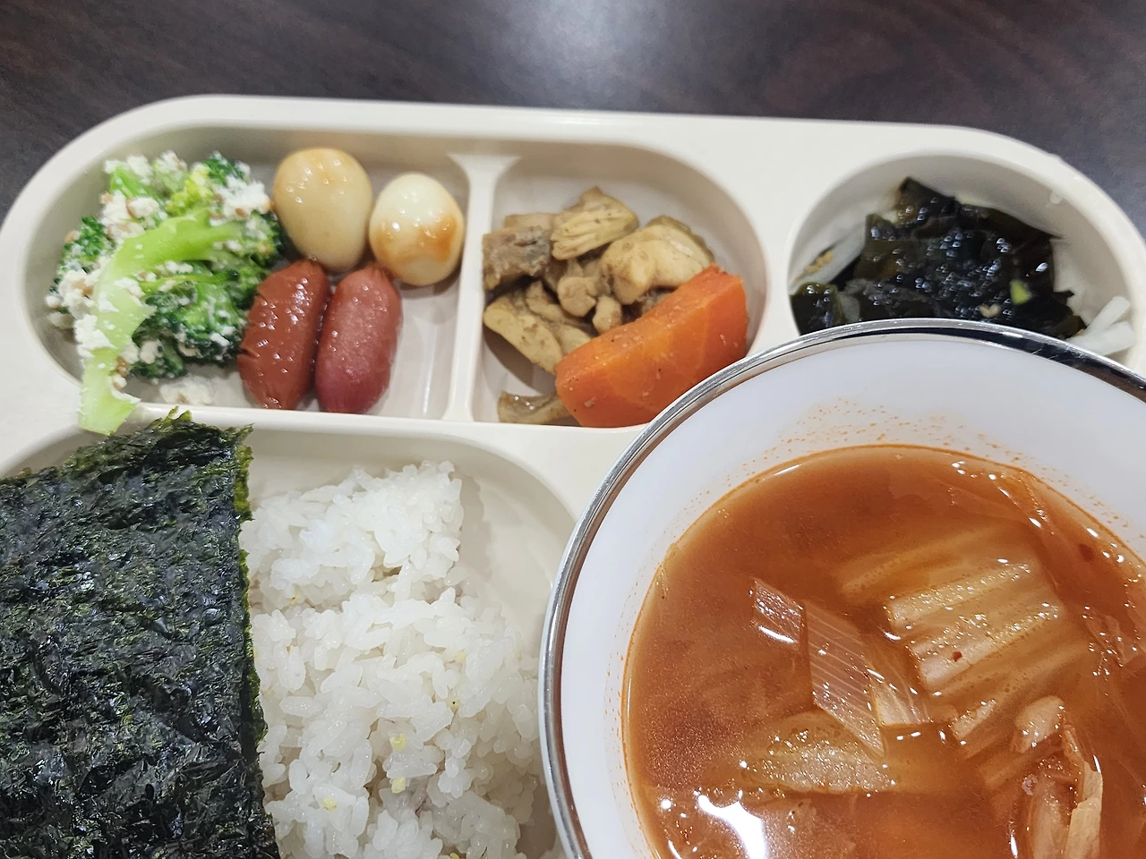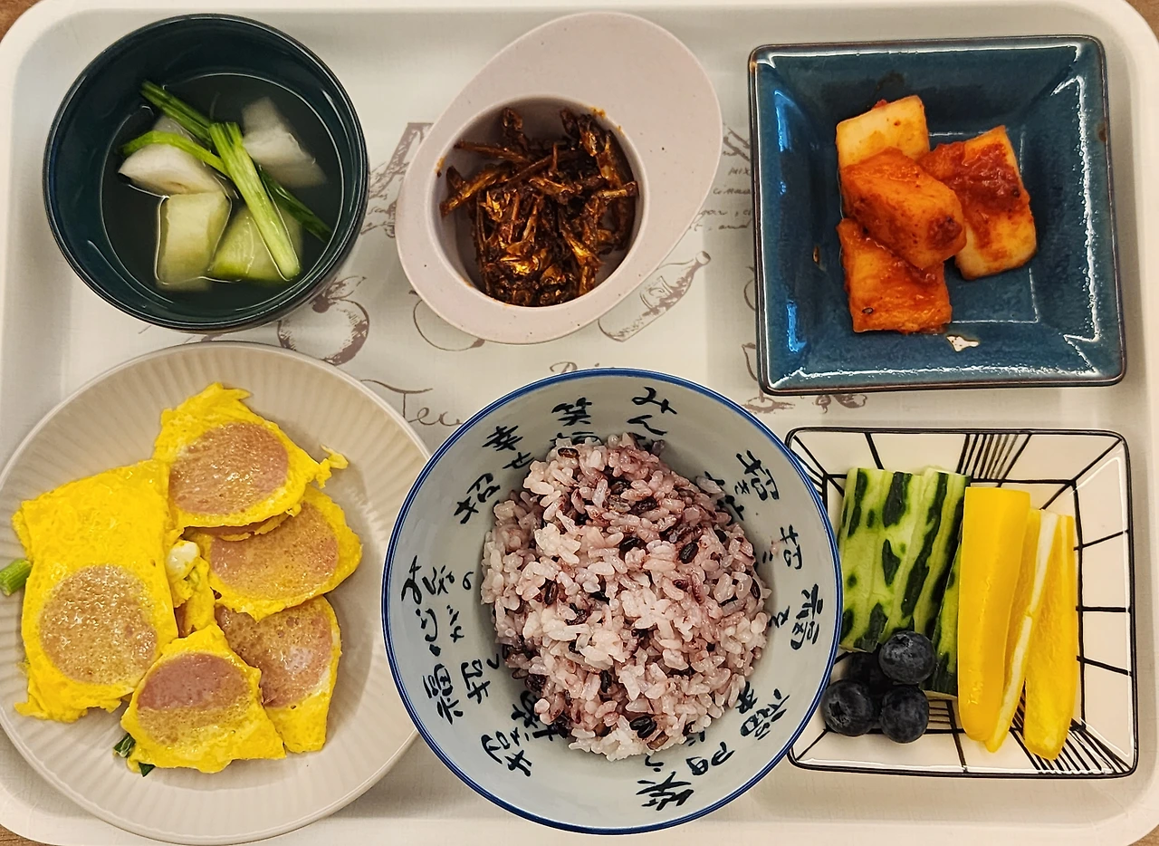 "깍두기가 아삭하고 맛있어. 멸치볶음도 간이 딱 맞고."