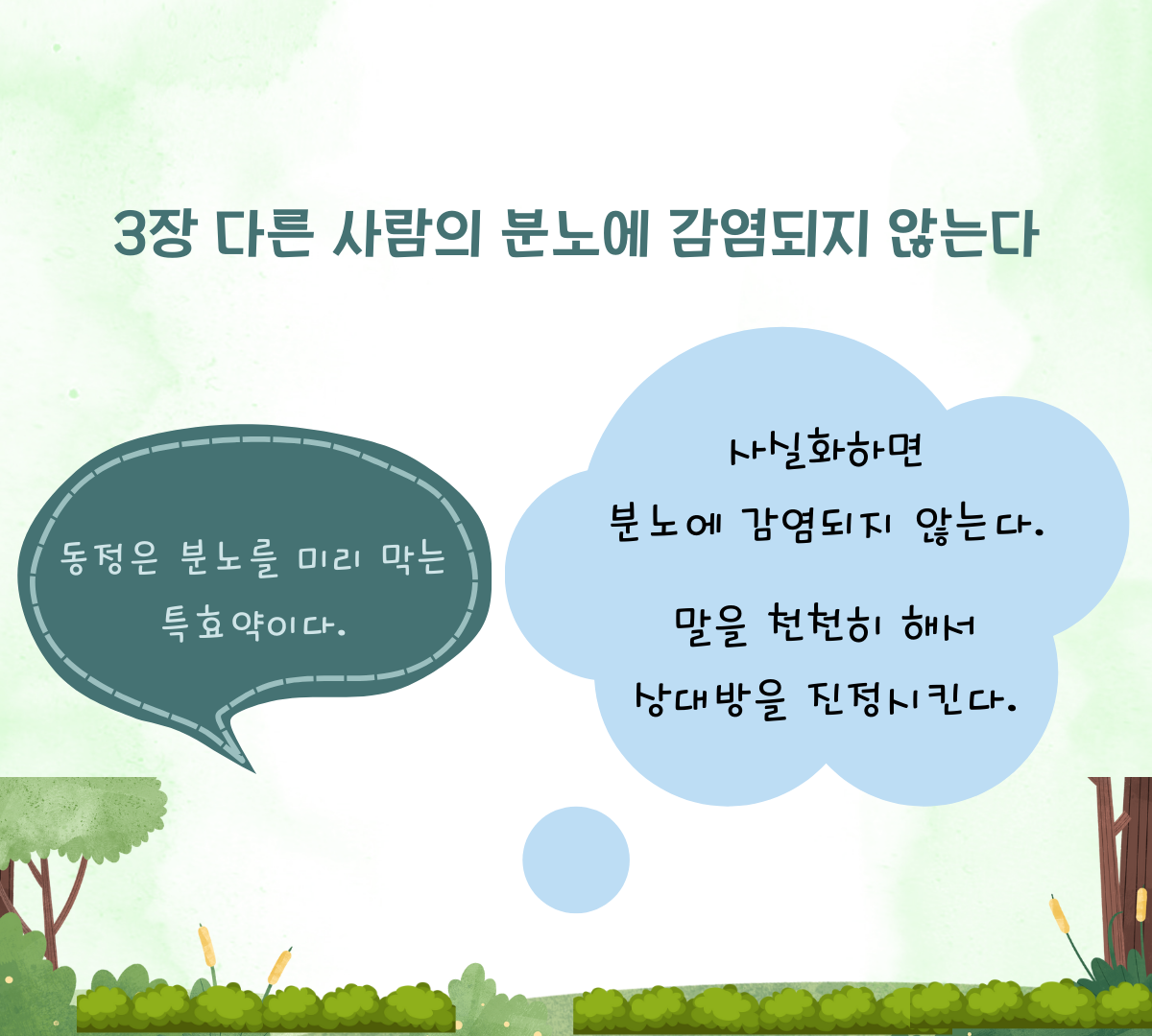 3장에서는 상대방의 분노에 감염되지 않는 방법을 제시하고 있다. 상대방의 상황을 어느 정도 알고 측은지심을 가진다면 분노를 한 템포 늦출 수 있단다. 또한, 상대방의 감정에 즉각적으로 반응하는 대신 말을 천천히 하면서 진정시키면 분노에 감염될 가능성이 줄어든다고 했다.