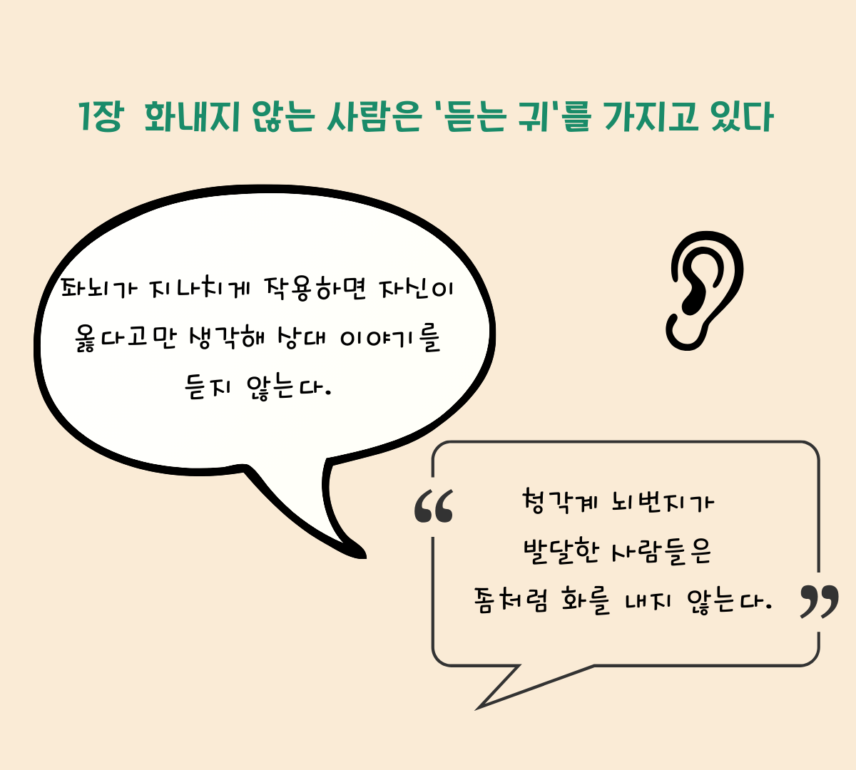 언어, 논리 등을 담당하는 좌뇌가 지나치게 작용하면 상대 이야기를 잘 듣지 않는 경향이 있단다. 자신만의 논리를 강조하며 고집을 피우는 사람들의 특징인 것 같다. 반면에 감정이 앞서서 사실이나 논리 따윈 가볍게 무시하는 사람들도 여럿 보았다. 하지만 이 책의 저자는 청각계 뇌번지가 발달한 사람들은 좀처럼 화를 내지 않는다고 했다. 쉽게 말해, 잘 듣는 사람들은 현실이나 전후 상황을 제대로 파악하고 판단 내리기 때문에 화를 낼 가능성이 적은 것이다.