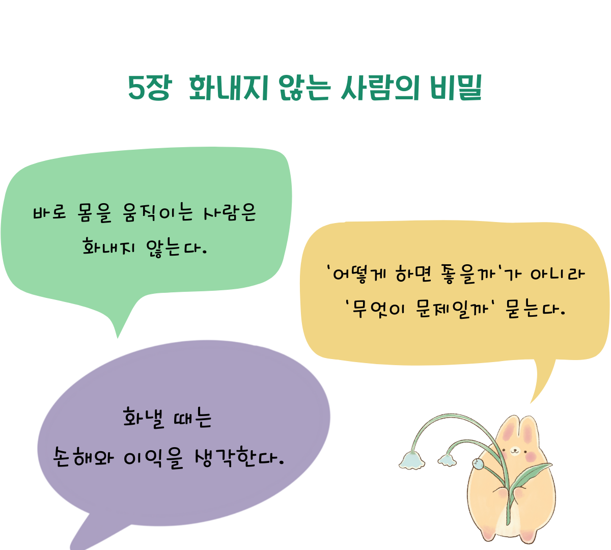 5장에서는 화내지 않는 사람의 특징 혹은 비밀을 분석하고 있다. 몸을 자주 움직이거나 부지런한 사람이 쉽게 화낼 확률이 적단다. 또한 그들은 '어떻게 하면 좋을까?' 대신 '무엇이 문제일까?'라며 문제의 본질에 접근하려고 노력한다.