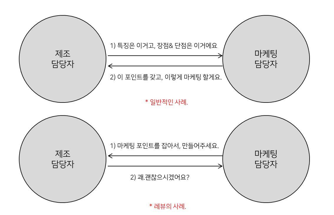 아마, 에이젼시(광고대행사)를 다니는 분들이라면 제품을 직접 만드는 과정까지의 경험이 거의 없을 것입니다. 이미 시중에 출시한 제품을 마케팅하는 것이지, 마케팅을 위한 제품을 출시하는 것은 아니니까요. 제조기반인 기업에서는 연구원들이 시장 조사를 바탕으로 제품을 만들고, 성능 / 장점 / 단점 들을 주르륵 나열해주면 그걸 갖고 마케팅팀에서 마케팅을 합니다. 이게 일반적인 구조입니다. 하지만 저희는 이것을 뒤집어서 생각했습니다.