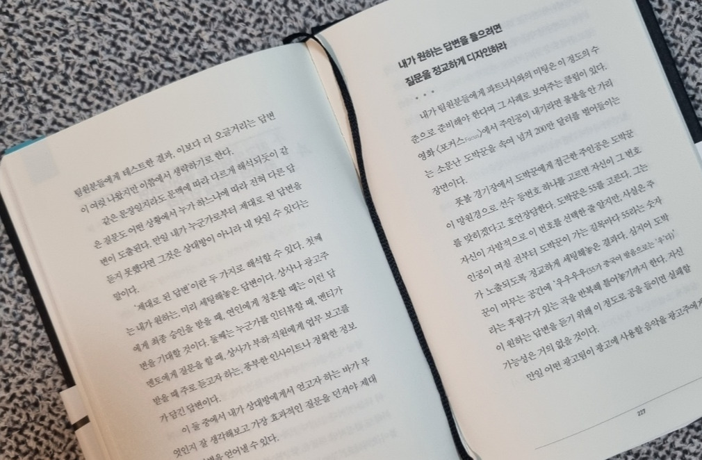 (226P 발췌) 같은 문장일지라도 문맥에 따라 다르게 해석되듯이 같은 질문도 어떤 상황에서 누가 하느냐에 따라 전혀 다른 답변이 도출된다. 만약 내가 누군가로부터 제대로 된 답변을 듣지 못했다면 그것은 상대방이 아니라 내 탓 일수 있다는 말이다.