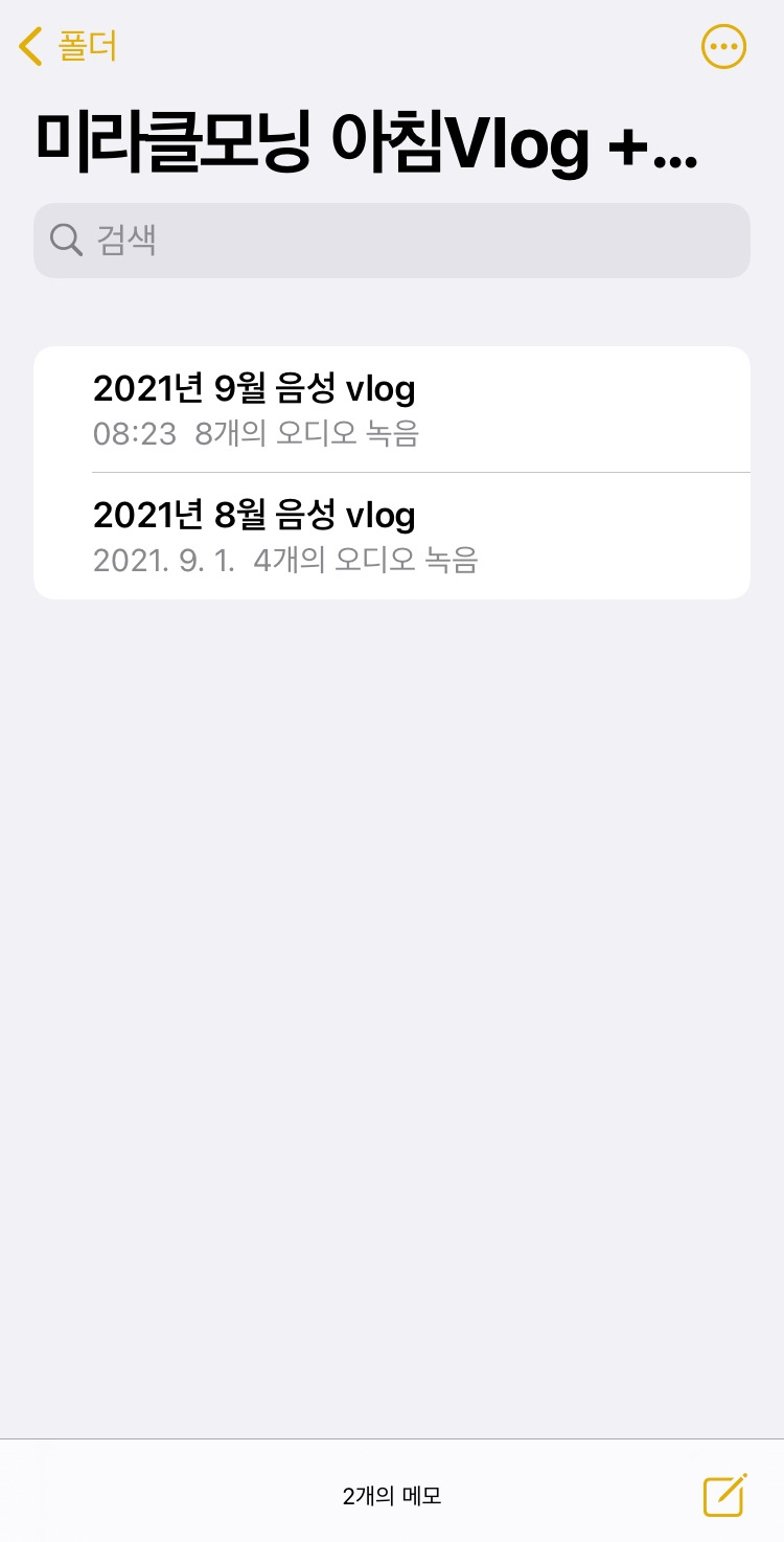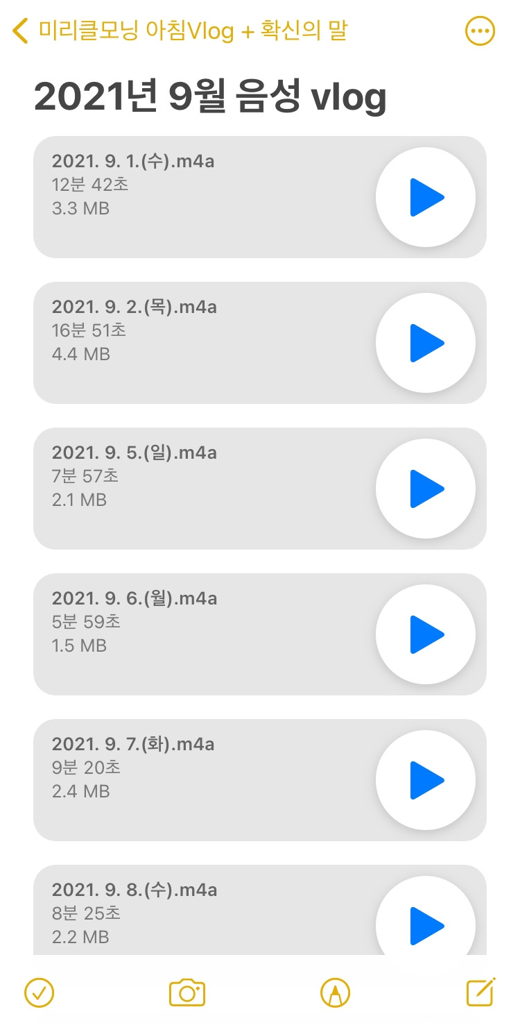 음성 메모는 다양한 부분에서 시너지 효과를 일으키는 것 같아서 출근길에는 꼭 수행할 계획이다. 주로 막바지 막히는 구간이다 보니 어어엇! 외마디를 외치고 잠시 침묵을 하는 구간도 많지만 어쨌거나 마무리까지 완료한 이 파일들을 어떻게 관리할까 고민하다가 아이폰 메모장 앱으로 공유하는 법을 알게 되어 우선은 그렇게라도 정리하기로 했다. 지난 음성을 듣지는 않지만 나중에 비교하는 용도로는 활용할 수 있을 것 같다.