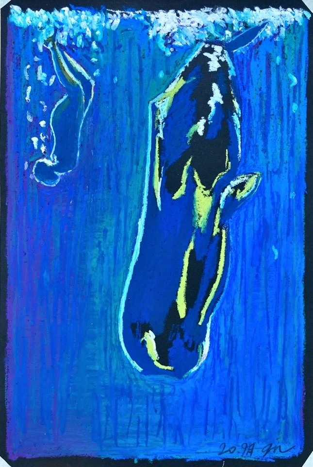 무엇을 그릴지 한참을 떠올리고, 이미지를 찾아보다가 다시 같은 푸른 빛의 바다로 돌아왔다. 다시 태어나면 어떤 존재로 태어나고싶냐는 물음에 늘 바닷속 거대한 고래로 태어나고 싶다는 말을 한다. 끝을 알 수 없는 심해를 고요하고 거대하게 유영하는 고래. 유유히 바닷속을 헤엄치며 바라보는 세상은 어떨까. 생의 섭리대로 작은 어류들을 섭취하고, 다시 자연에 있는 그대로 배설하며. 푸르른 생태계를 관조하는 삶. 그렇게 몇 십여 년을 살아가다가 수명이 다하면 다시 자연의 깊은 곳 어딘가로로 돌아가는 삶.