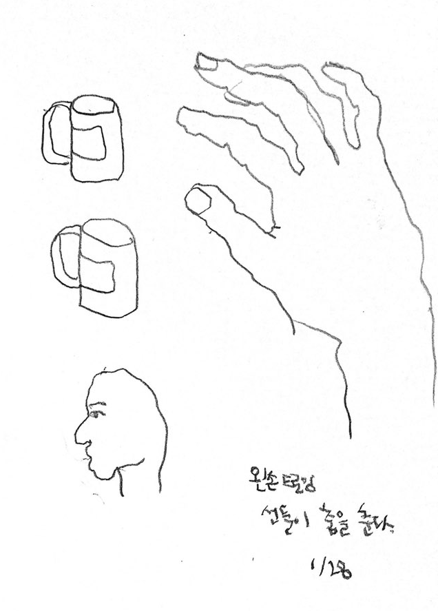 아침마다 드로잉으로 하루를 시작해야겠다는 마음을 실천하고자 종이를 펼쳤다. 첫 드로잉은 무목적적인 드로잉이면 좋겠다 싶어 선을 죽 그었다. 또 선을 그었다. 어느새 며칠을 같은 종이 한 바닥에 선만 죽죽 그었다. 선을 죽죽 긋다보니 평소 그림을 그릴 때 지나쳤던 습관을 발견했다. 오른손잡이인지라 그런지, 주로 왼쪽에서 오른쪽으로 긋는 선을 긋는다. 위에서 아래로 내려오는 선이 아래에서 위로 가는 선보다 편하다. 드로잉을 하다보면 선의 방향이 다종다양하게 오가야 할 때가 있는데, 간혹 오른쪽에서 왼쪽 또는 아래에서 위로 가는 선을 그을 때 그 불편한 감각을 우회하려고 종이를 돌리곤 했다. 며칠 동안 선만 그어보니, 불편해서 회피했던 그 감각을 결국 마주했다. 막상 마주하니 나의 의도와 다르게 흘러가는 선의 이탈이 흥미로웠다. 내가 가고자 했던 방향은 그 방향이 아닌데 선들은 이미 휘어져 저 멀리로탈주해버리곤 했다. 흥미로움을 느낌과 동시에 나의 이성은 자유로이 탈주하는 곡선형의 선을 직선형으로 만들고자 개입했다. 처음에 떠올린 선의 형상이 직선이었기에, 직선 외의 선들은 이성에게 있어 ‘서툴고 미숙한’ 선이었기 때문이다. 탈주하는 선들은 서툴고 미숙한 선일까? 탈주하는 선들을 보니 아이들의 글씨가 떠올랐다. 구불구불하고 균일하지 않은 크기의 글자들. 그 글자들을 반듯하게 쓰도록 훈련하는 것은 마땅히 필요한 과정일까? 바른 글씨와 바른 선이라는 것이 있을까?