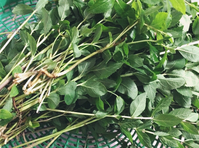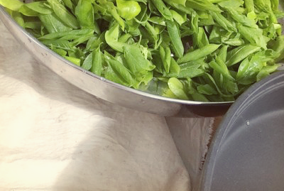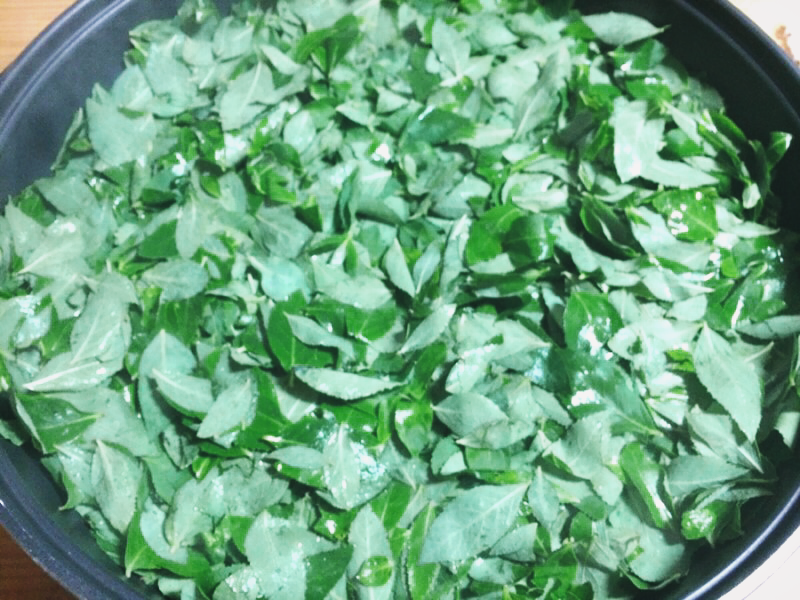 • 준비물: 씻어 손질한 감잎, 면장갑, 면포, 시간, 노력, 프라이팬을 준비한다. 보통은 명절 때 흔히 사용하는 큰 전기팬을 사용하지만 귀하신 감잎 새순이라 양이 적어서 보통의 프라이팬을 사용했다.