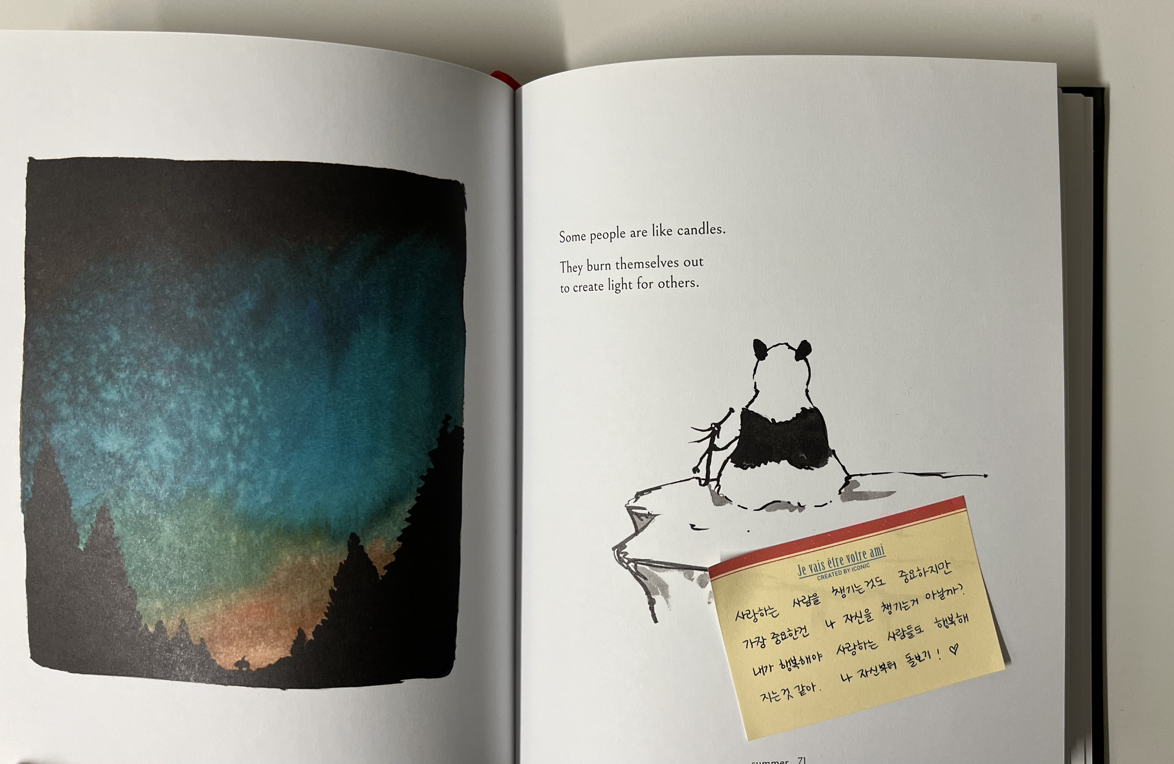 화장실에서 몰래 읽은 친구의 편지는 나를 엉엉 소리 내서 울게 만들었다. 회사 화장실인데도 터져 나오는 울음 때문에 한동안 밖에 나갈 수 없었다. 저 칸에 누구 있어? 누구야? 왜 울어? 무슨 일이야? 궁금해하는 사람들을 마주칠 수 없어서 모두가 화장실을 떠날 때까지 한참을 더 울었다. 그리고 집에 와서 그림책을 펼쳤다. 맨 앞장에 메모지가 붙어있었다. '이 책이 너에게 작은 위로와 응원이 되어주길, Feb 2024'