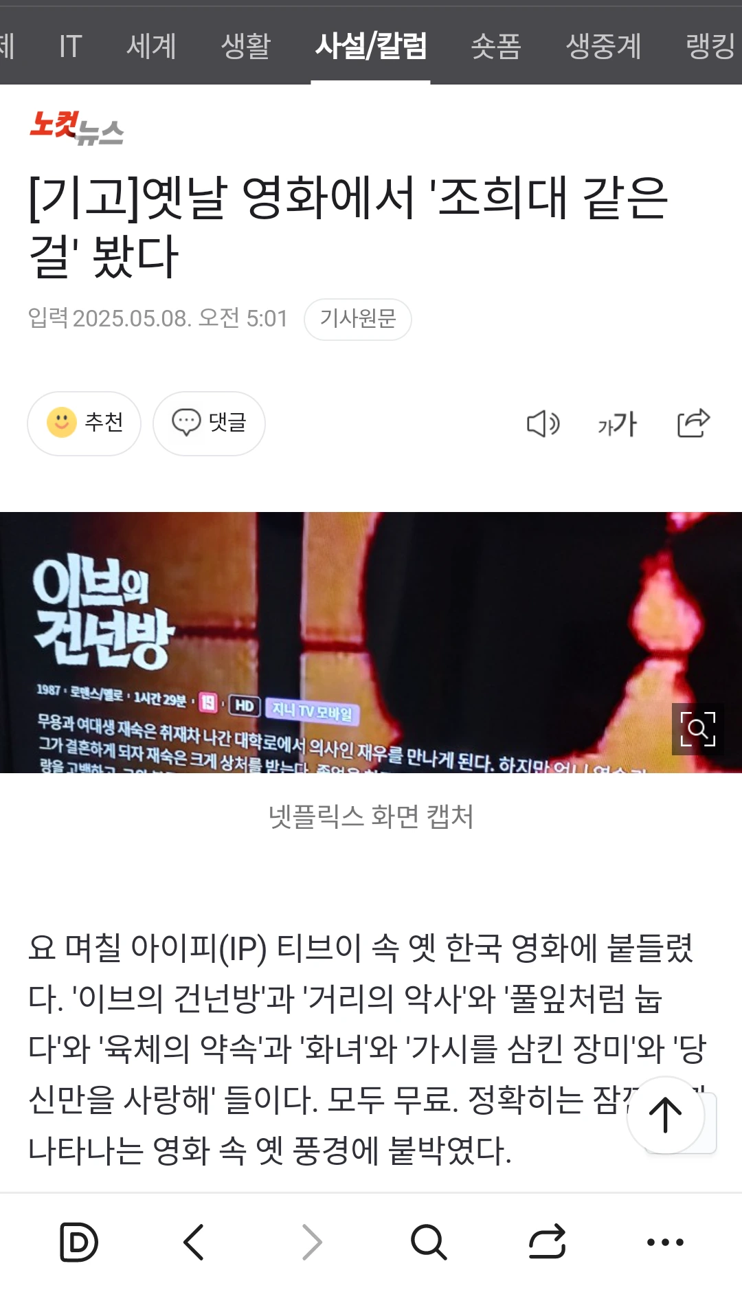 티브이 속 이런저런 무료 영화를 살피다가 ‘이브의 건넌방’ 개봉 연도인 1987년에 사로잡힌 게 시작. 내가 열아홉 살이던 때 한국 모습이 담겼을 성싶어 관람 버튼을 눌렀다.