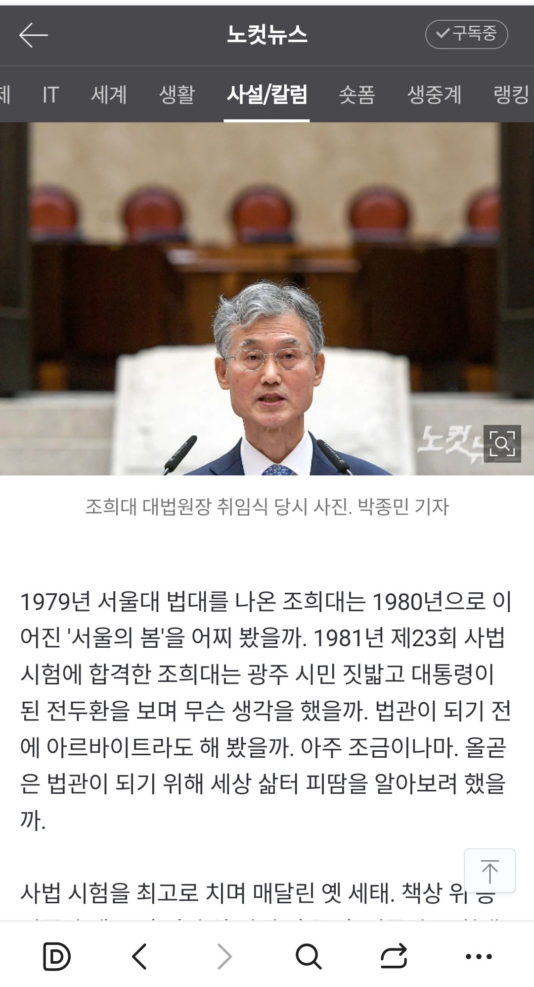 1979년 서울대 법대를 나온 조희대는 1980년으로 이어진 ‘서울의 봄’을 어찌 봤을까. 1981년 제23회 사법 시험에 합격한 조희대는 광주 시민 짓밟고 대통령이 된 전두환을 보며 무슨 생각을 했을까. 법관이 되기 전에 아르바이트라도 해 봤을까. 아주 조금이나마. 올곧은 법관이 되기 위해 세상 삶터 피땀을 알아보려 했을까.
