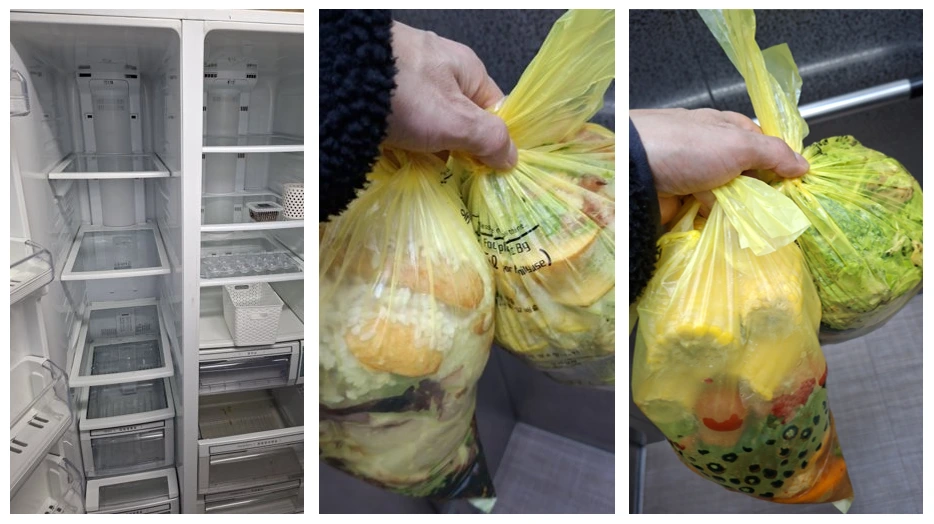 ▴속 비운 냉장고(왼쪽)와 상한 음식물. 20일 밤 여러 번 버렸다.