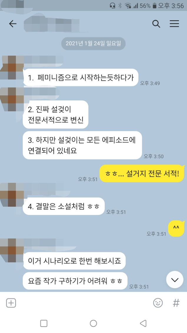 가까운 오십 대 남자에게 <설거지맨(가제)> 애벌 원고를 미리 읽어 봐 달라 했습니다. “페미니즘으로 시작하는 듯하다가 진짜 설거지 전문 서적으로 변신”하지만 “설거지는 모든 에피소드에 연결돼 있”고 “결말은 소설처럼” 끝났다는군요.