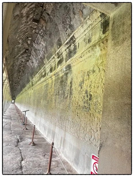 벽면에는 신들의 지옥과 천당이 그려져 있고, 압사라 여신들의 문양도 약 1,800개 이상이라고 한다. 전쟁을 나가는 모습들, 삶이 담긴 문양들 그 속에는 찬란했던 크메르 문명이 그대로 녹아져 있었다. 건축물 자재는 사암으로 만들어진 석재다. 돌을 일정한 크기로 잘라서 쌓아 올린 다음 그 위에 조각을 했다고 한다. 3만여 명의 인력이 약 37년 동안 지었다고 하는데 믿기 어려웠다.