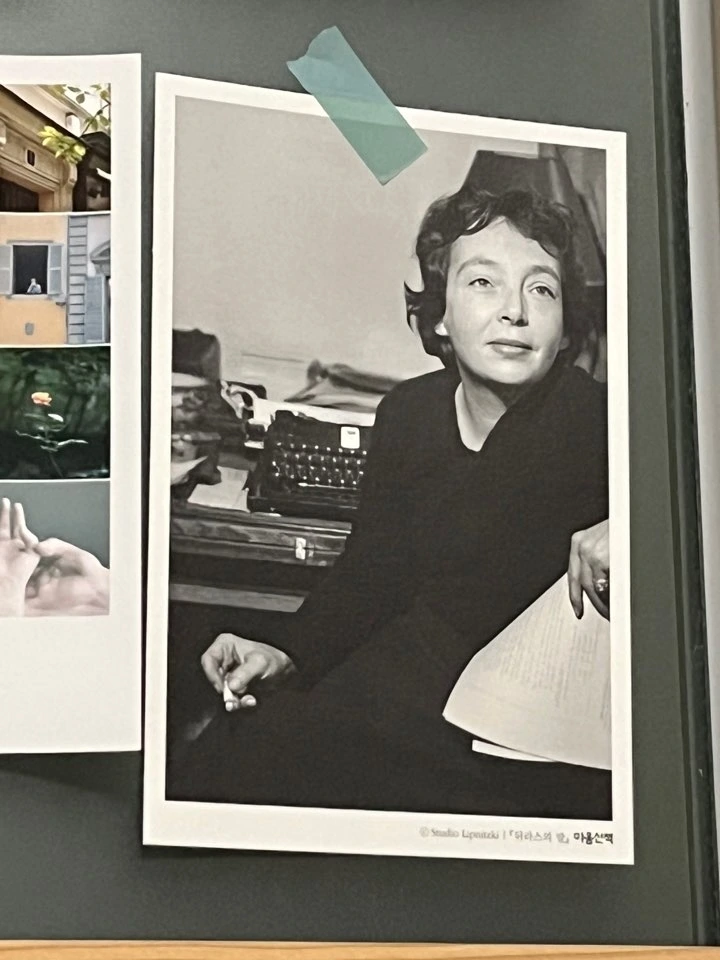 서재 방의 벽면에 뒤라스 사진을 붙였다. 책을 샀더니 표지를 엽서로 보내준 것이다. 한 손에는 몽당연필만큼 짤막해진 담배를, 다른 한 손엔 빼곡한 글이 담긴 원고를 쥐고 있다. 원고를 쥐고 있는 손에 있는 반지는 디자인이 대담하지만 그녀의 표정은 차분하고 온화해 보인다. 그 뒤로 타자기가 놓여있다. 전형적인 작가 사진이다. 몇 살 즈음의 사진일까, 어떤 작품을 쓸 때의 사진일까, 사실 아무것도 중요하지 않다.