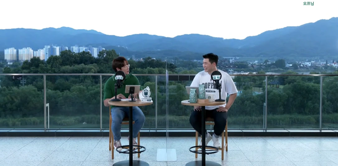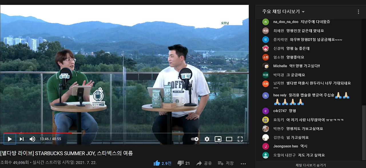 몇일 전 스타벅스 앱을 통해 스타벅스가 성시경과 함께 '별다방 라이브' 를 유튜브 한다는 소식을 들었습니다. 평일 저녁 7시반이라 집에서 저녁 준비를 하면서 들었죠. 전국 스타벅스 매장 중에서 가장 아름다운 매장으로 손꼽히는 스타벅스 더양평 DRT점에서 진행됬는데 초록초록한 배경 속에서 진행되는 모습만으로도 힐링이 되더라구요