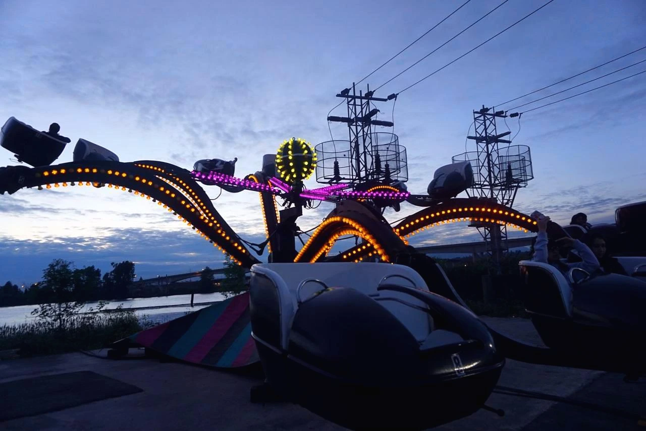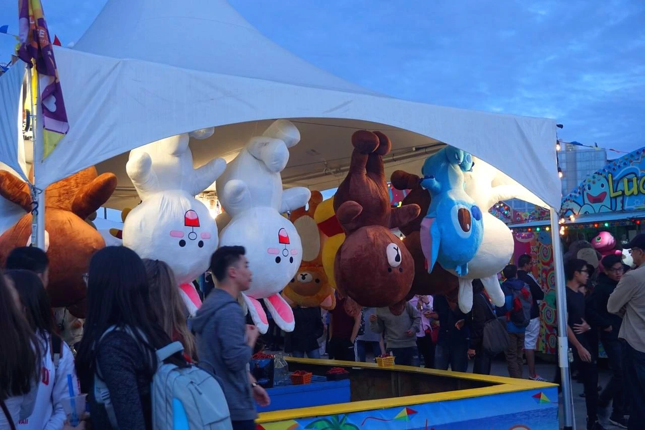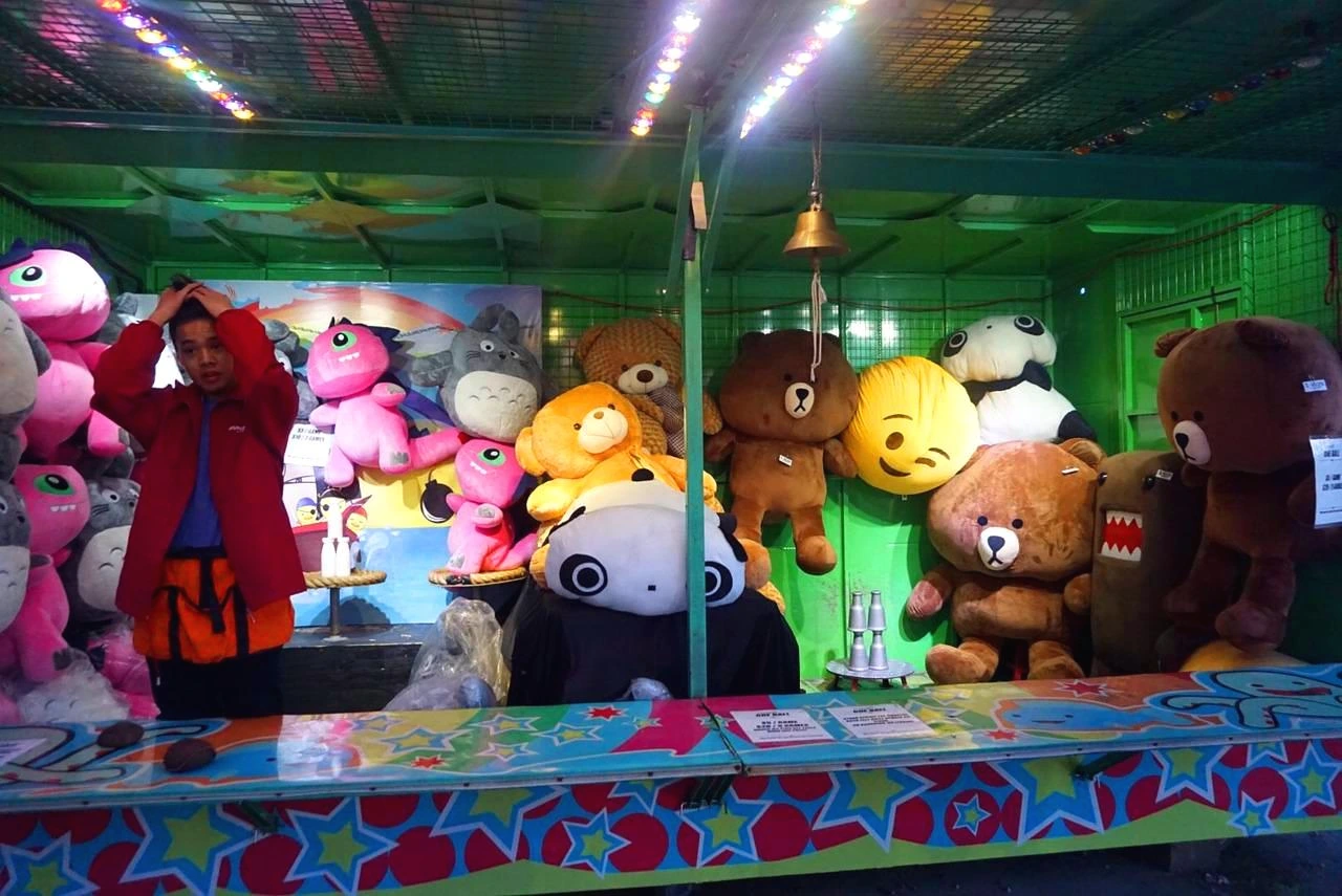 야시장 안쪽에 놀이기구가 하나 있었다. 회전하며 돌아가는 놀이기구였다. 우리는 같이 놀이기구를 탔다. 처음에는 재미없는 줄 알았는데 나중에는 너무 빨리 돌아서 소리를 질러댔다. 놀이기구를 탄 후 옆에 있는 게임 코너를 갔다. 게임에 우승하면 인형을 타는 것이었는데 공 굴리기, 러시안룰렛, 낚시 등 많은 게임들이 있었다. 친영은 구름다리를 건너는 게임을 시도했는데 인형을 타 가지는 못했다. 그 외에도 다양한 문구와 액세서리를 팔았고 이곳에서 양말도 살 수 있었다.